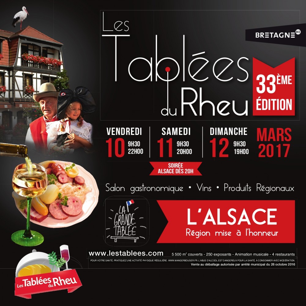 Vendredi 10, samedi 11 et dimanche 12 mars 2017, « Les Tablées du Rheu » organisent leur 33ème édition. Sur une surface de 5 200m², cette manifestation culinaire accueillera quelque 220 exposants, plus de 32 000 visiteurs, six restaurants, des espaces d’exposition et d’animation ainsi qu’un fournil.