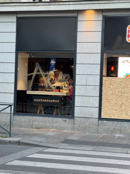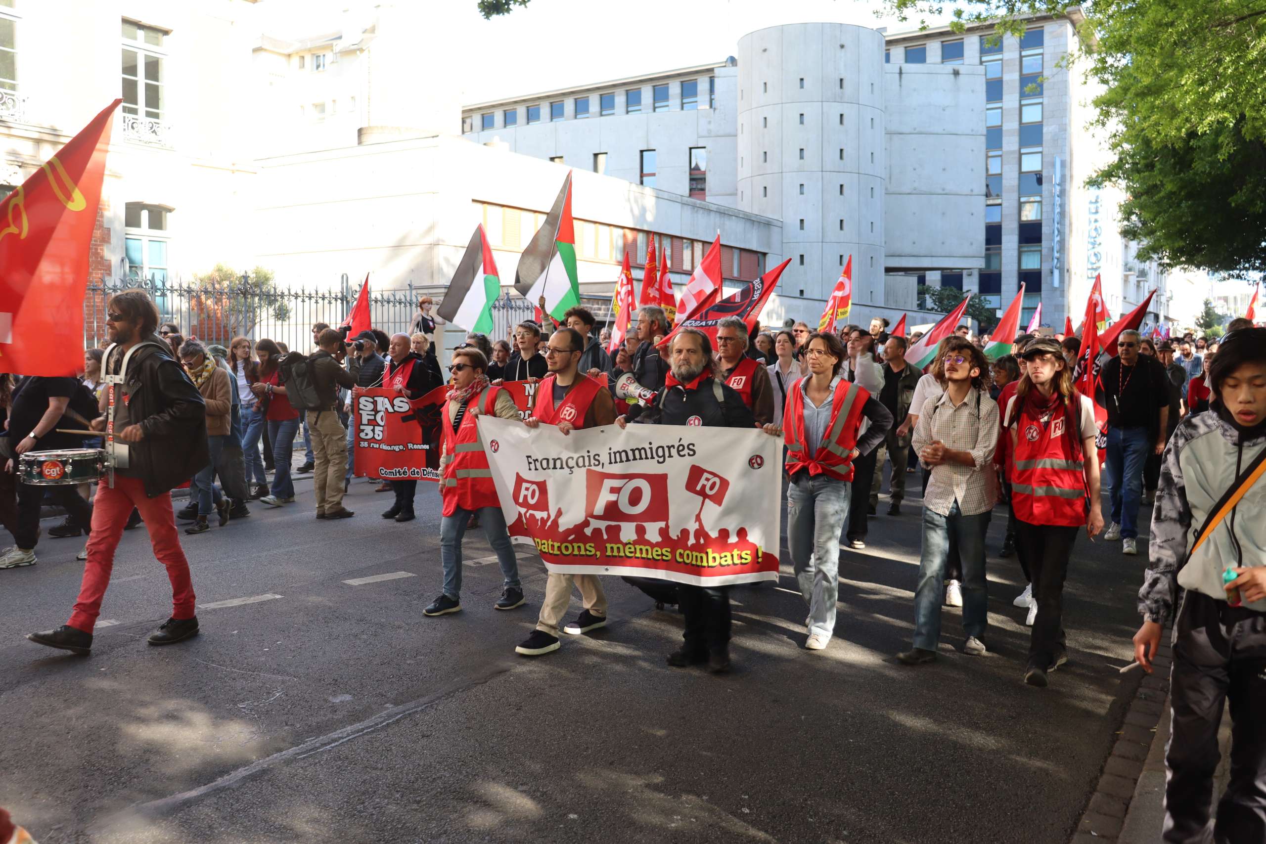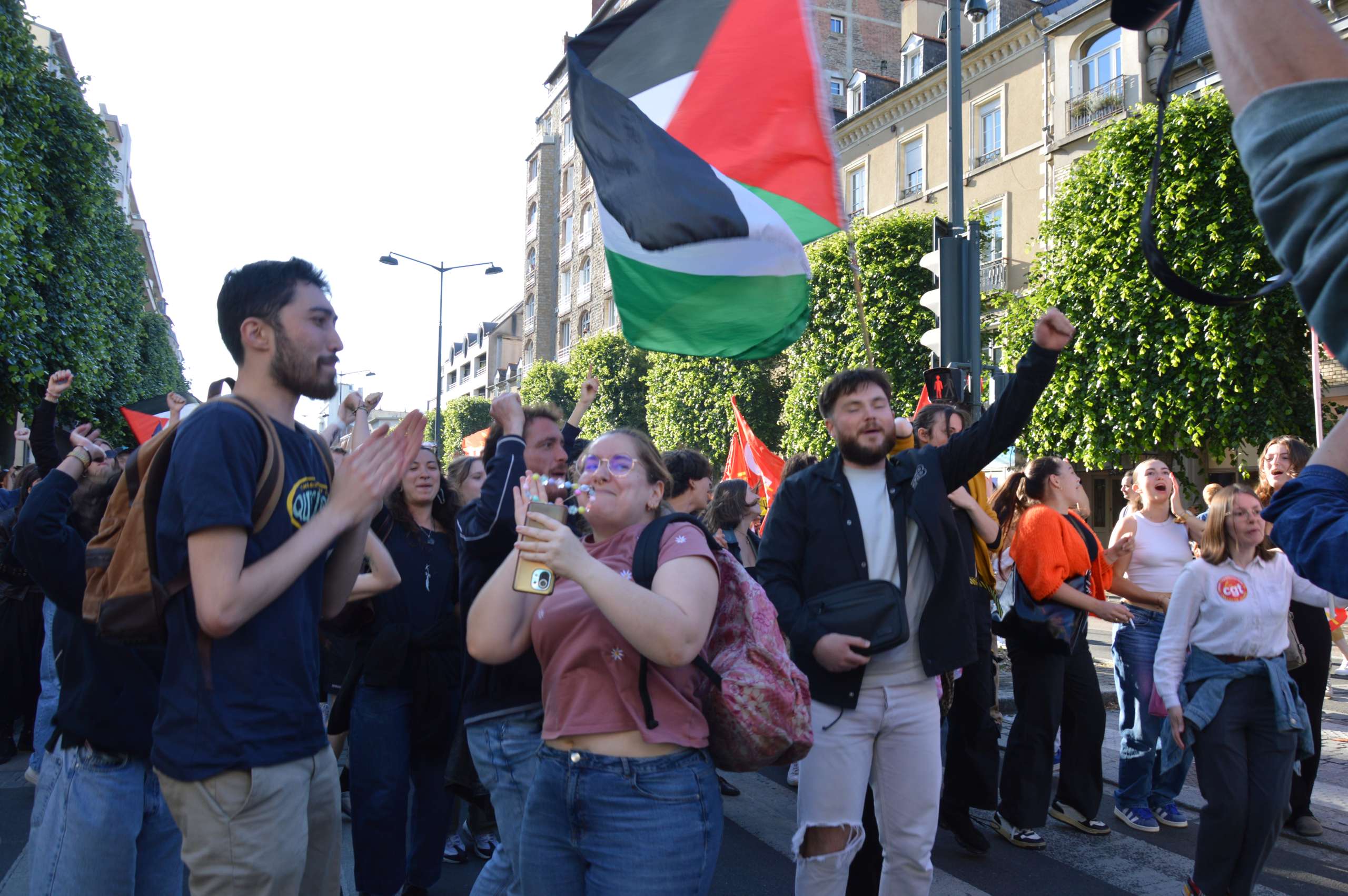 Vers 19 h, parfois sous les drapeaux palestiniens, les manifestants (jeunes et moins jeunes) sont partis en cortège vers le boulevard de la Liberté, avant de rejoindre les quais. Vers 19 h 30, une trentaine de membres de l’ultragauche a profité du rassemblement pour dégrader un distributeur automatique de billets et des panneaux place de Bretagne. « Des tags antifascistes ont également été apposés », note la préfecture.