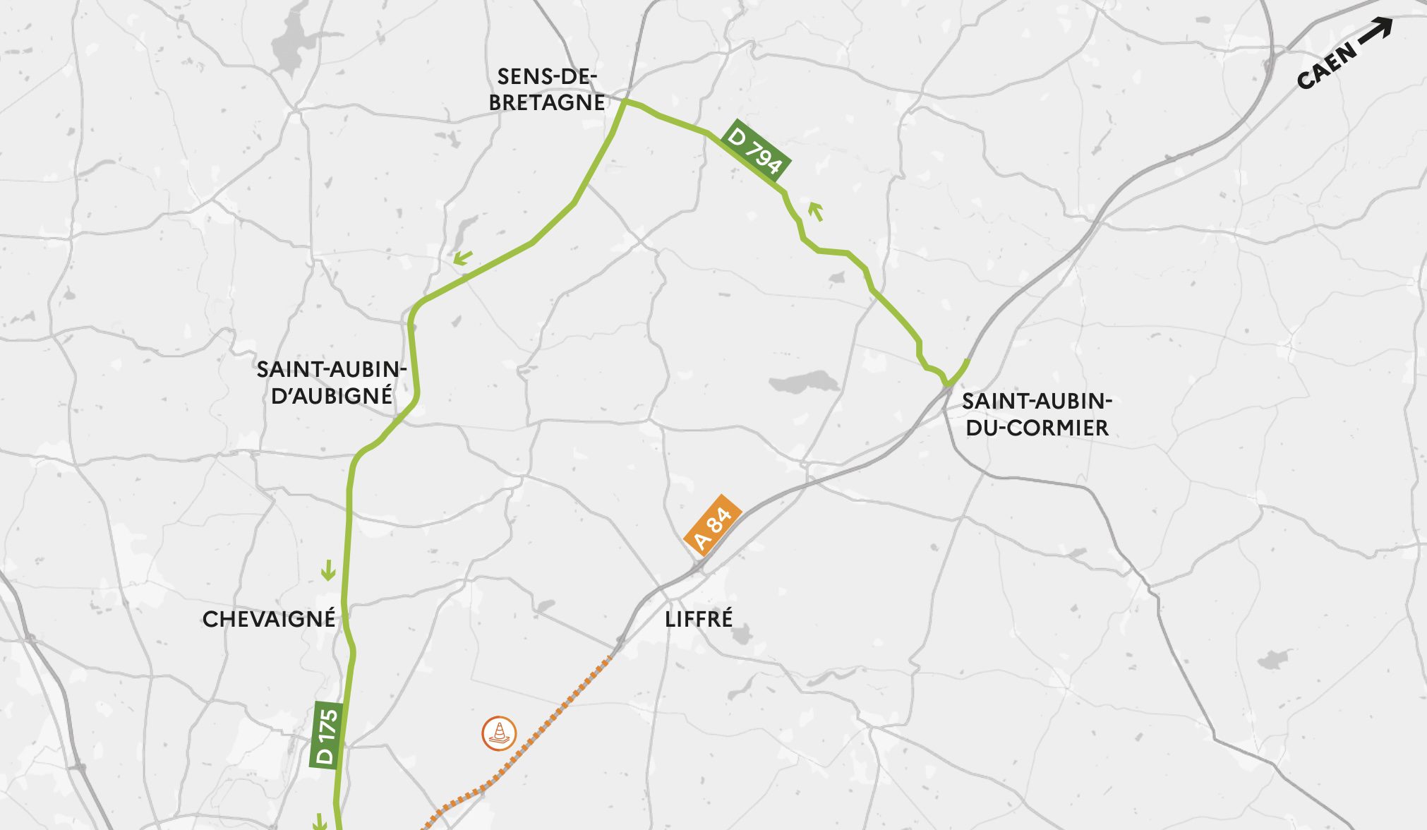 Pendant la durée du chantier, certaines portions de l’autoroute seront fermées la nuit, entre 20 h et 6 h. Entre le 23 mars et le 26 mars, puis du 7 au 17 avril, l’A84 sera fermée en direction de Rennes, sur 19 kilomètres, entre Saint-Aubin-du-Cormier et la rocade rennaise. Une déviation sera mise en place via la RD 794 puis la RD 175. Ensuite, entre le 26 mars et le 3 avril, puis du 20 avril au 7 mai, la circulation sera interrompue en direction de Caen, entre Liffré et Saint-Aubin-du-Cormier, avec une déviation par la RD 812.