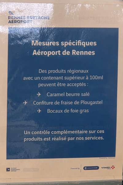 Le plus savoureux dans cette histoire, c’est qu’il existe des mesures spécifiques (voir photo ci-dessus). Le caramel de beurre salé bénéficie d’un régime dérogatoire, tout comme la confiture de fraises de Plougastel. Ils peuvent voyager dans un contenant supérieur à 100 ml. Le foie gras passe crème aussi. Mais le pâté Hénaff, emblème né en 1907 à Pouldreuzic, en terre bigoudène, se voit signifier un refus net.