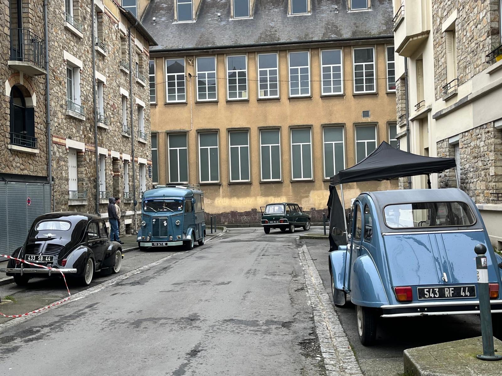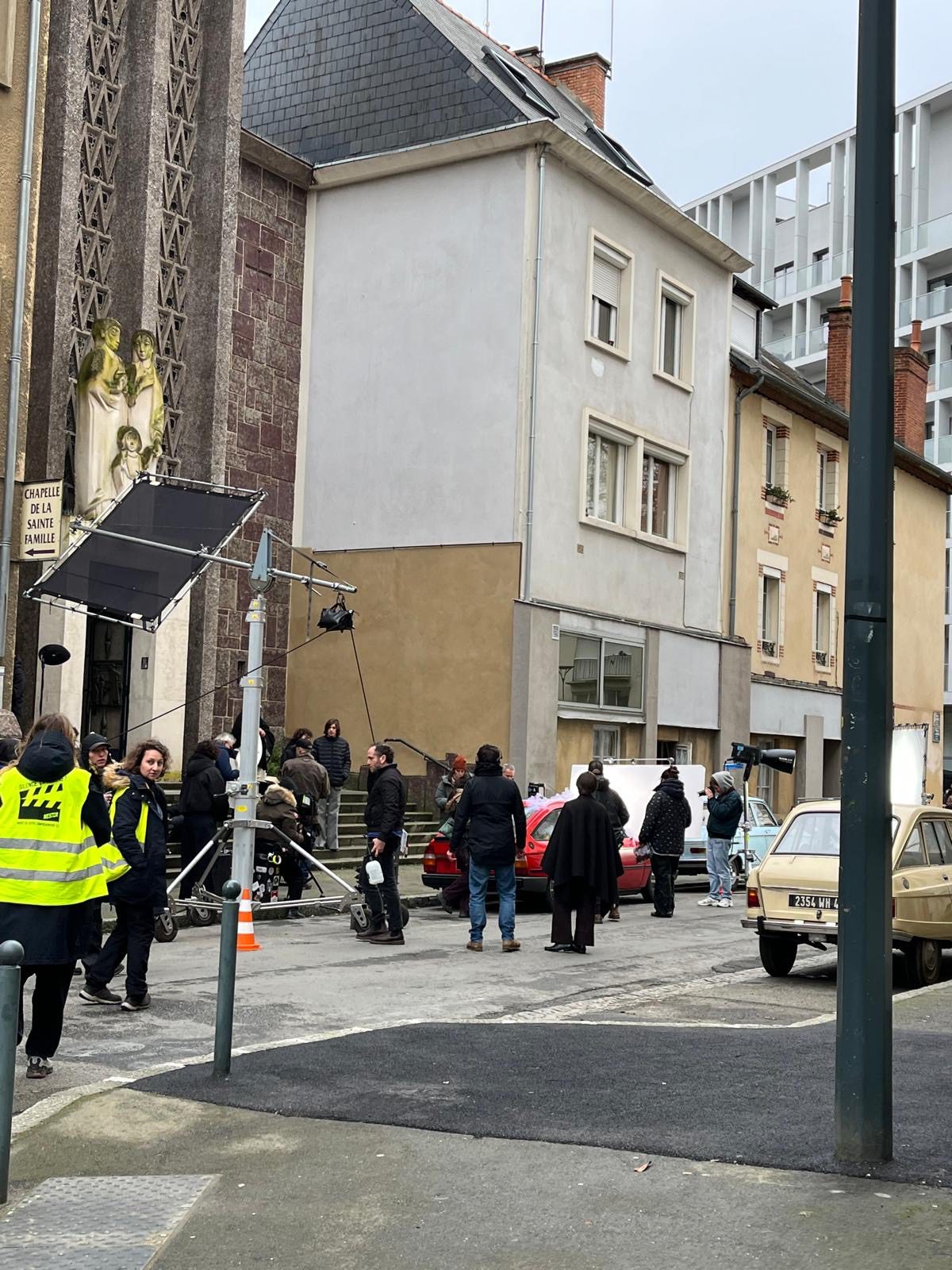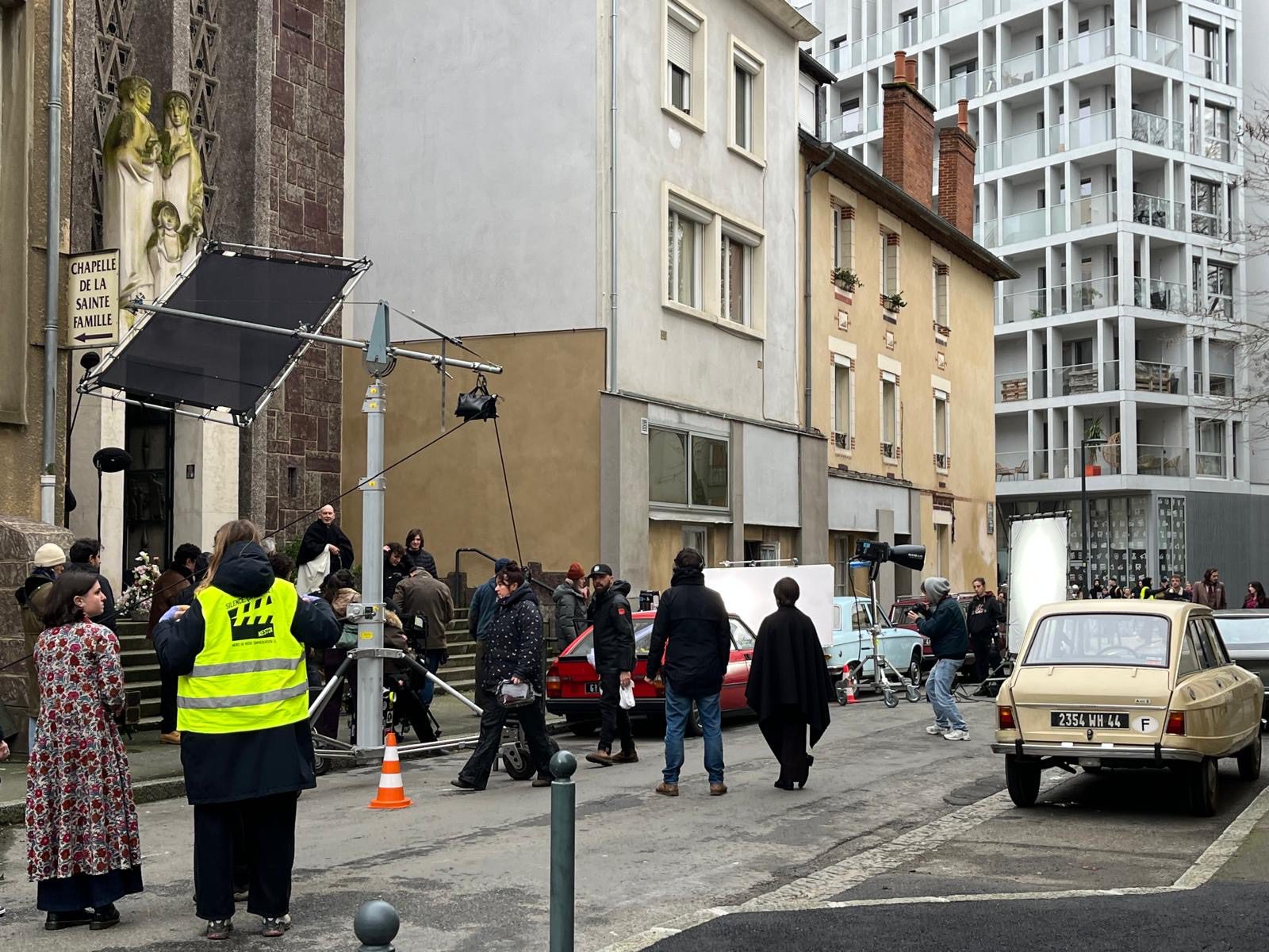 En ce lundi pluvieux, la rue du Vieux Cours a changé de tempo. Exit la sulfateuse qui sort tous les lundis du parking Colombier pour verbaliser les mauvais payeurs de stationnement ! Exit les voitures qui passent en trombe pour éviter les bouchons du boulevard de la TA ! Les moteurs sont coupés. Silence, on tourne ! Sous un ciel laiteux, des voitures couleur crème, surgies d’un autre temps, s’alignent le long du trottoir. Devant le Café Cortina, , sous la façade discrète de la chapelle Sainte-Famille, les habitués cèdent la place aux techniciens emmitouflés, aux comédiens maquillés.