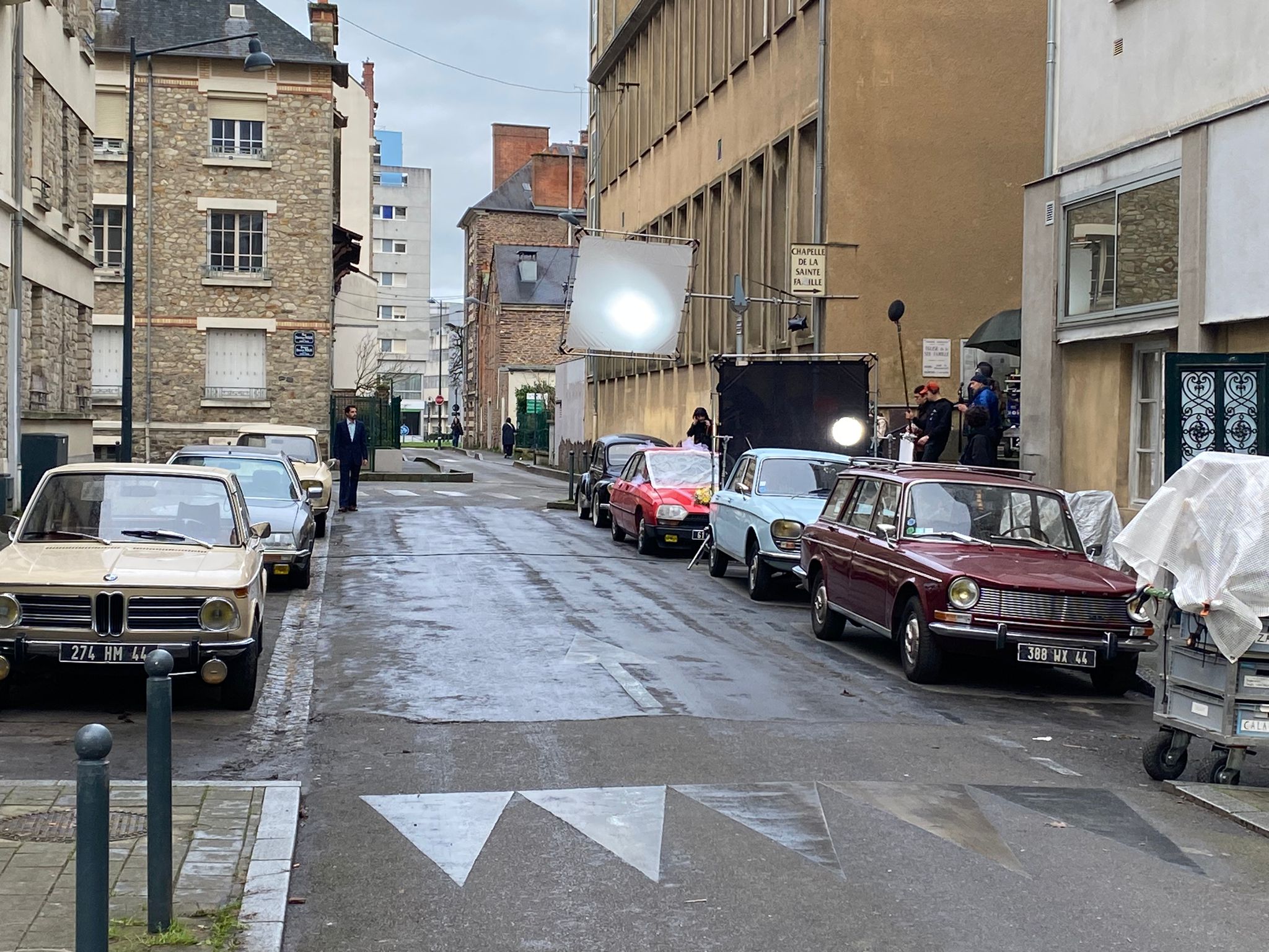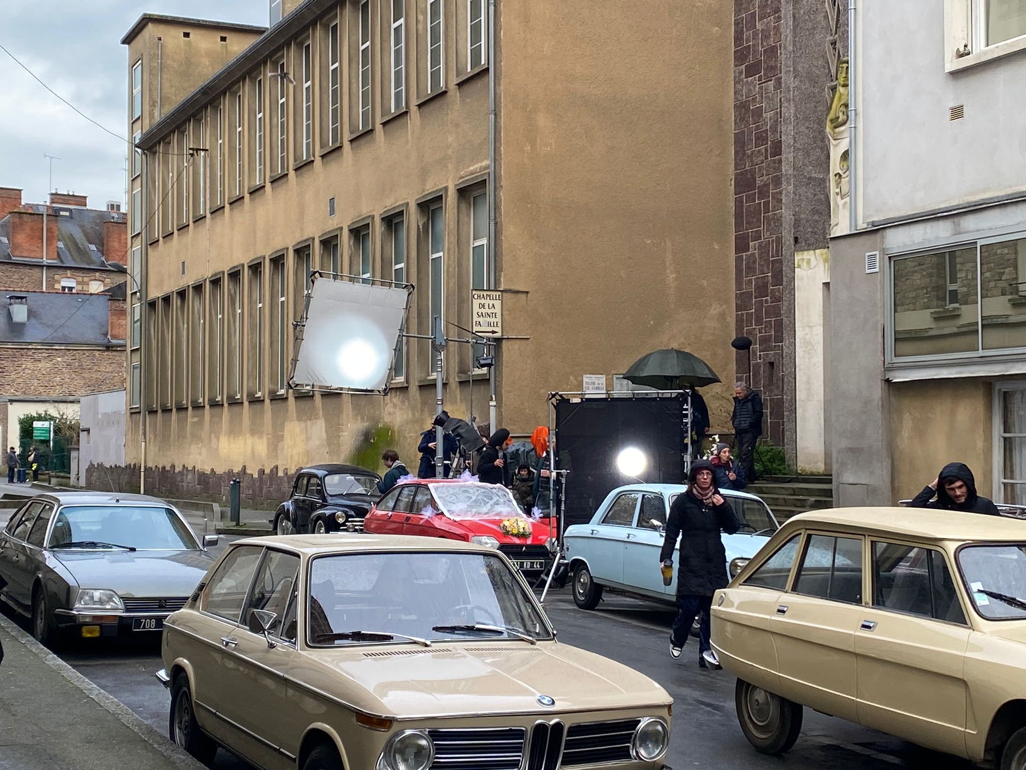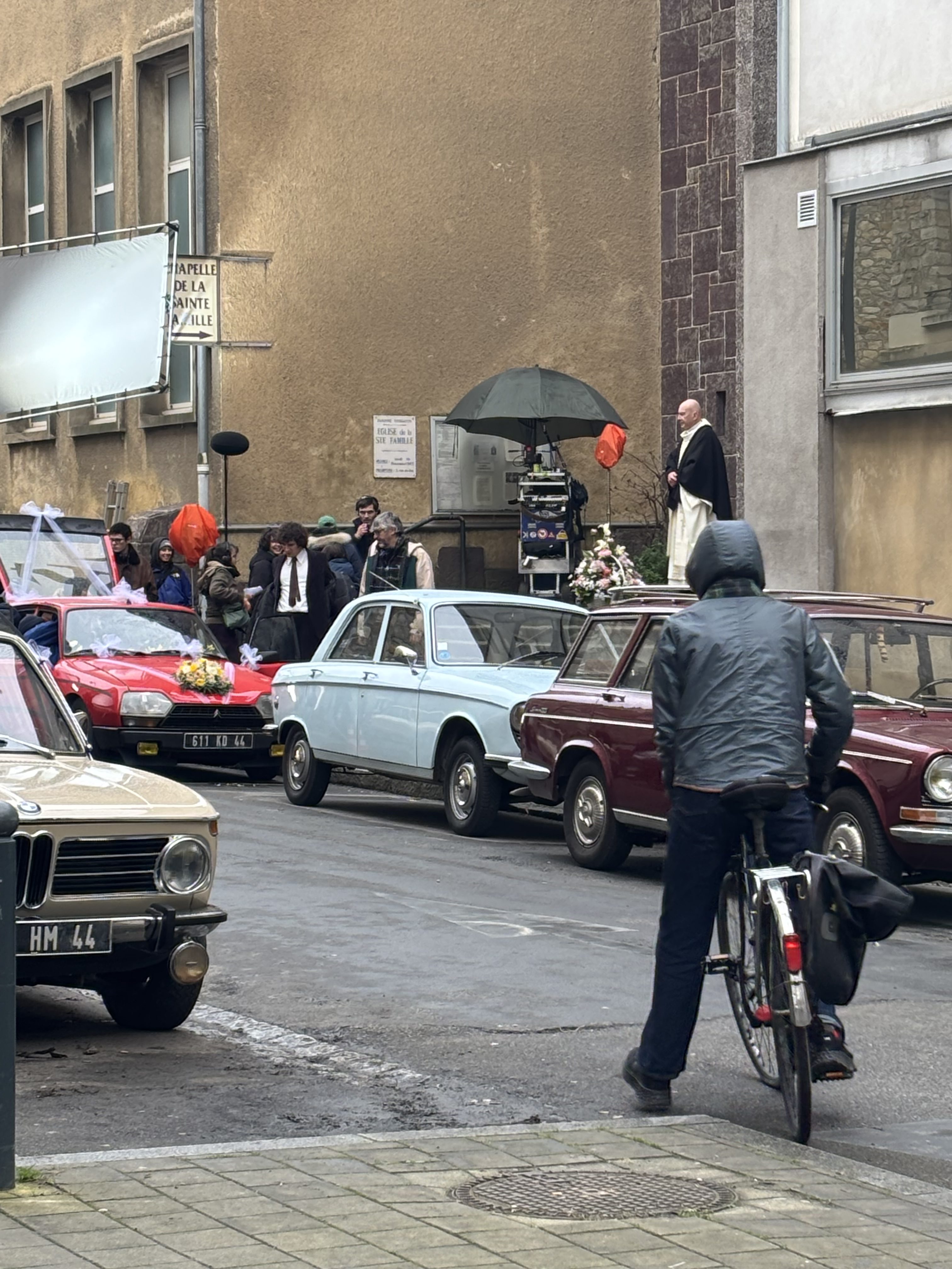 En ce lundi pluvieux, la rue du Vieux Cours a changé de tempo. Exit la sulfateuse qui sort tous les lundis du parking Colombier pour verbaliser les mauvais payeurs de stationnement ! Exit les voitures qui passent en trombe pour éviter les bouchons du boulevard de la TA ! Les moteurs sont coupés. Silence, on tourne ! Sous un ciel laiteux, des voitures couleur crème, surgies d’un autre temps, s’alignent le long du trottoir. Devant le Café Cortina, , sous la façade discrète de la chapelle Sainte-Famille, les habitués cèdent la place aux techniciens emmitouflés, aux comédiens maquillés.