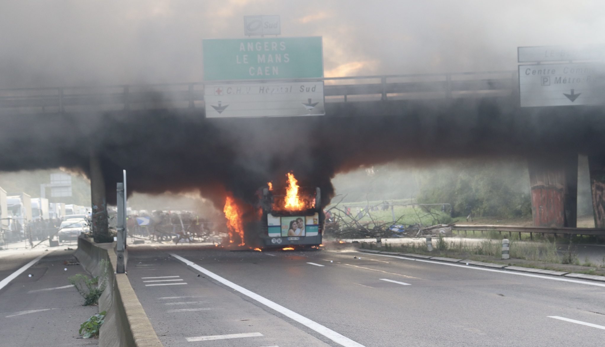 Ce soir, la rocade sud de Rennes a rouvert partiellement, mais la circulation reste difficile. Dans le sens extérieur (Rennes–Paris), les voitures roulent de nouveau depuis 21 h 30, à une vitesse limitée à 70 km/h. Dans l’autre sens, Paris–Rennes, le trafic reprendra à 1 h 30, uniquement depuis la porte d’Angers vers la porte d’Alma. L’accès au centre-ville par la porte d’Alma restera fermé pour plusieurs jours, annonce ce soir la préfecture. Les automobilistes doivent passer par la porte d’Angers. Raison invoquée : le pont d’Alma pourrait avoir été fragilisé par un incendie du bus survenu ce 10 septembre. Des expertises techniques sont désormais en cours sur l’ouvrage et conditionneront toute réouverture. Parti vide de son dépôt de Saint-Jacques-de-la-Lande selon notre confère Ouest-France, le car avait été arrêté vers 7 h par les manifestants. Les protestataires avaient contraint le conducteur à descendre de son bus. L’homme est indemne mais choqué. La société Star envisage de porter plainte. « Des débordements inadmissibles, notamment l’incendie volontaire d’un bus du Star qui heureusement ne transportait pas de voyageurs, et des heurts avec les forces de l’ordre, ont eu lieu aujourd’hui », explique la maire de Rennes, Nathalie Appéré. « J’apporte mon soutien à celles et ceux qui ont subi ces actes inadmissibles, en particulier au chauffeur du bus et aux équipes de Keolis. Une plainte va être déposée. Alors même que la manifestation préalablement déclarée, qui a réuni des milliers de manifestants dans le centre de Rennes, s’est déroulée dans le calme, des groupes violents ont cherché l’affrontement avec les forces de sécurité intérieure et tenté de commettre des dégradations une grande partie de la journée. Je salue les forces de sécurité et de secours ainsi que l’ensemble des agents publics pour leur mobilisation. »