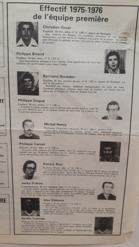 Dans ce club, le basket a toujours été le marqueur principal. « Au cours de la saison 74-75, le club avait enrôlé son premier américain, et l’équipe avait belle allure », se souvient un Rennais. « Il y avait Christian Gruel, Bertrand Boëdec (dont la carrière avait été brisée par un tragique accident), Philippe Dugué, Michel Henry, Patrick Ruiz, Philippe Carnet, Jacky Dubois, Abe Gibbons et Apollo Cosmas. Le salle rue de Papu était surchauffée et chaleureuse. On s’y sentait merveilleusement bien… «