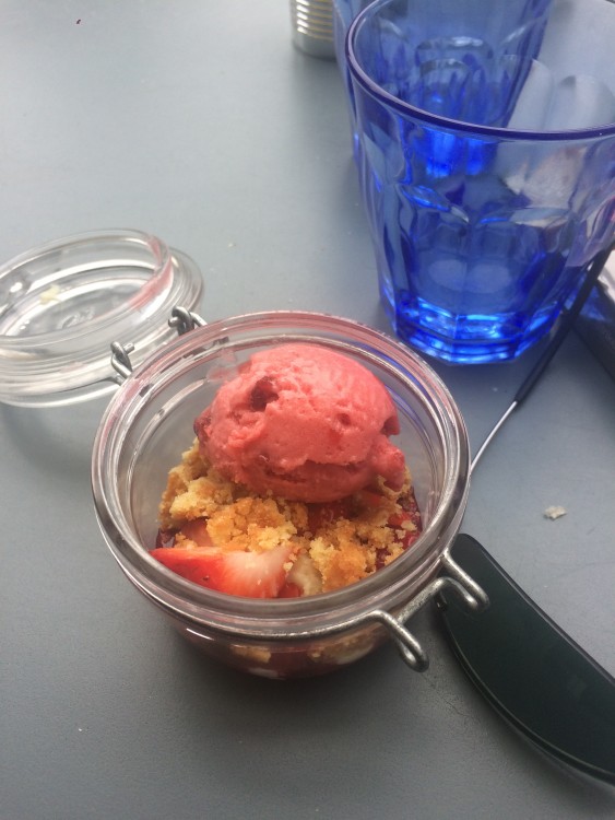 Mais en ces jours printaniers, on a opté pour la terrasse et ses chaises bleues en osier. On a commandé un 1/4 de poulet rôti avec frites maison accompagné par un petit vin conseillé par le sommelier Sébastien. Rien de tel pour se mettre en bouche et enfiler le dessert maison : un chocolat blanc fraise.