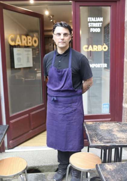 C’est la classe à l’italienne ! Polo noir, tablier violet, allure élégante et regard chaleureux : Gabriele Muti ne passe pas inaperçu dans son petit restaurant rennais, Carbò, situé rue Saint-Georges. Chaque midi, les files d’attente s’allongent invariablement devant chez lui. « Beaucoup font la queue », glisse-t-il sans forfanterie.