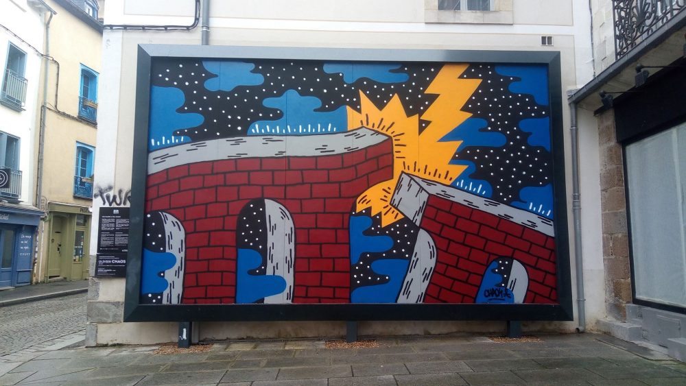 Habitué des galeries parisiennes et rennaises, Olivier Chaos est artiste à découvrir au plus vite sur le Mur. Mais pas seulement…Dans le cadre du Festival Urbaines Pratiques Tendances, Olivier Chaos est en expo à la MJC Antipod avec FZR Sethi et Avyze. Prochain artiste : Le Parisien Speedy Graphito sera présent le dimanche 5 avril.