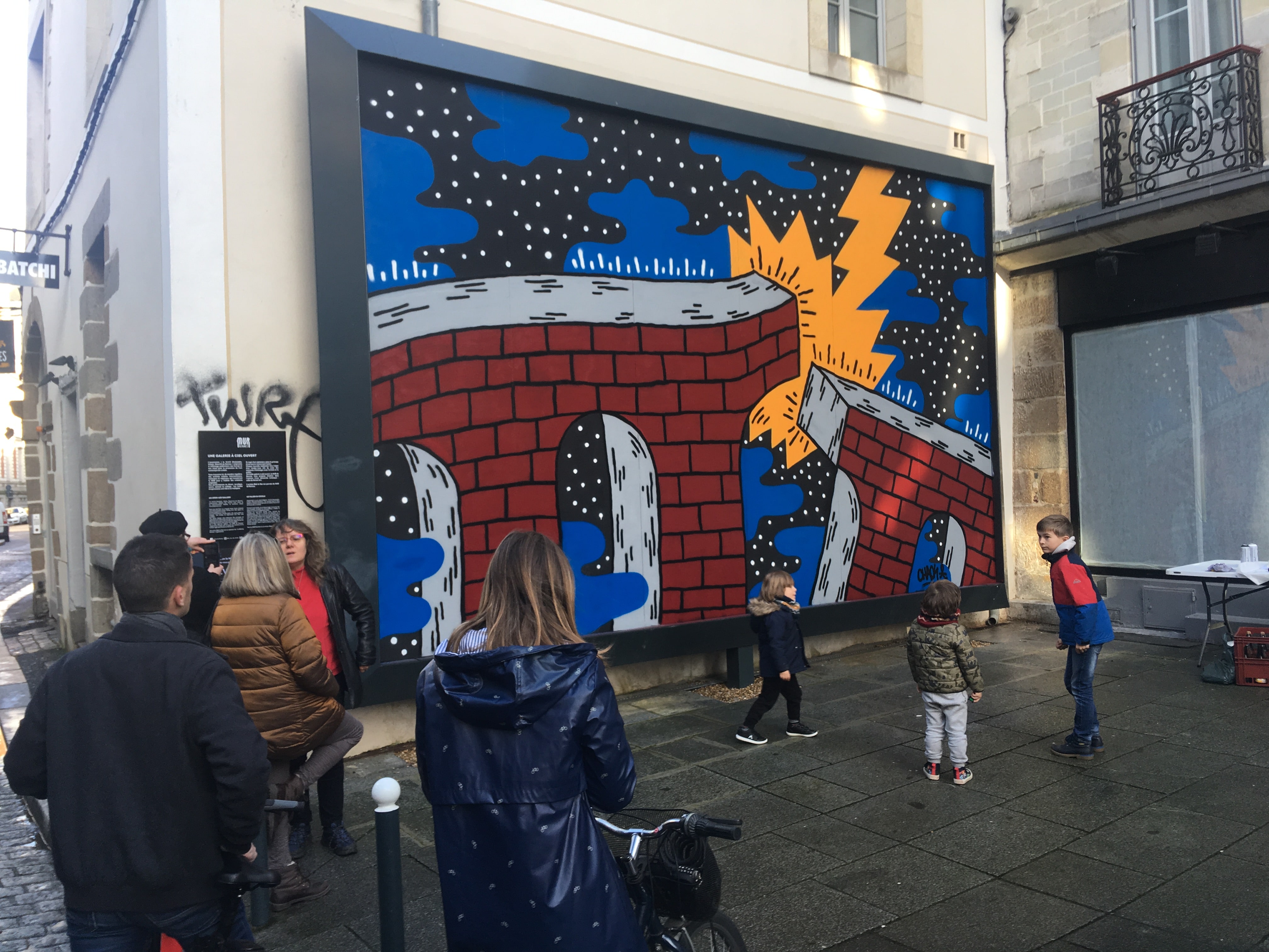 Olivier Chaos a trouvé un nouveau moyen d’expression : Le Mur. Rue Vasselot, il a en un éclair de temps trouvé l’inspiration pour dessiner un pont de pierre sous un nuage étoilé et de nuages bleus ! De son œuvre jaillit l’éphémère joie, éprouvée au fil des pages des dessinateurs américains de la scène californienne comme Rick Griffin ou Crumb.