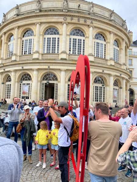 Par ce défi, le cinquantenaire compte aider la recherche médicale à combattre les cancers infantiles. Parti le 6 juillet, à 11 h, place de la Mairie, il y est revenu ce samedi 26 août, en présence de nombreux amis et sous un ciel griseux. Il bouclait un long périple en forme de cœur, comme un joli clin d’œil aux enfants malades. « C’est sympa de le revoir, » commentait un de ses proches. « C’est encore mieux qu’il ait réussi son challenge. »