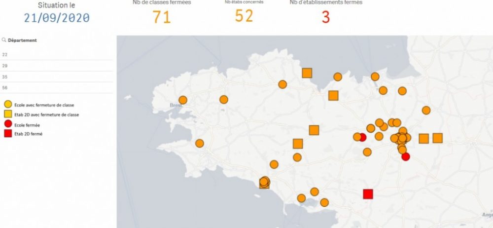 La Bretagne compte actuellement 21 clusters (+4), en cours d’investigation par l’ARS Bretagne : 13 en Ille-et-Vilaine (1 en établissement de santé, 4 en EHPAD, 7 en milieu scolaire et universitaire et 1 en sphère privée) ; 1 dans les Côtes d’Armor (1 en EHPAD) ; 5 dans le Finistère (3 en milieu scolaire et universitaire, 1 en EHPAD et 1 en établissement pour personnes handicapées) , 2 dans le Morbihan (1 en milieu scolaire et universitaire et 1 en sphère privée). Lire notre article du jour sur le CHU