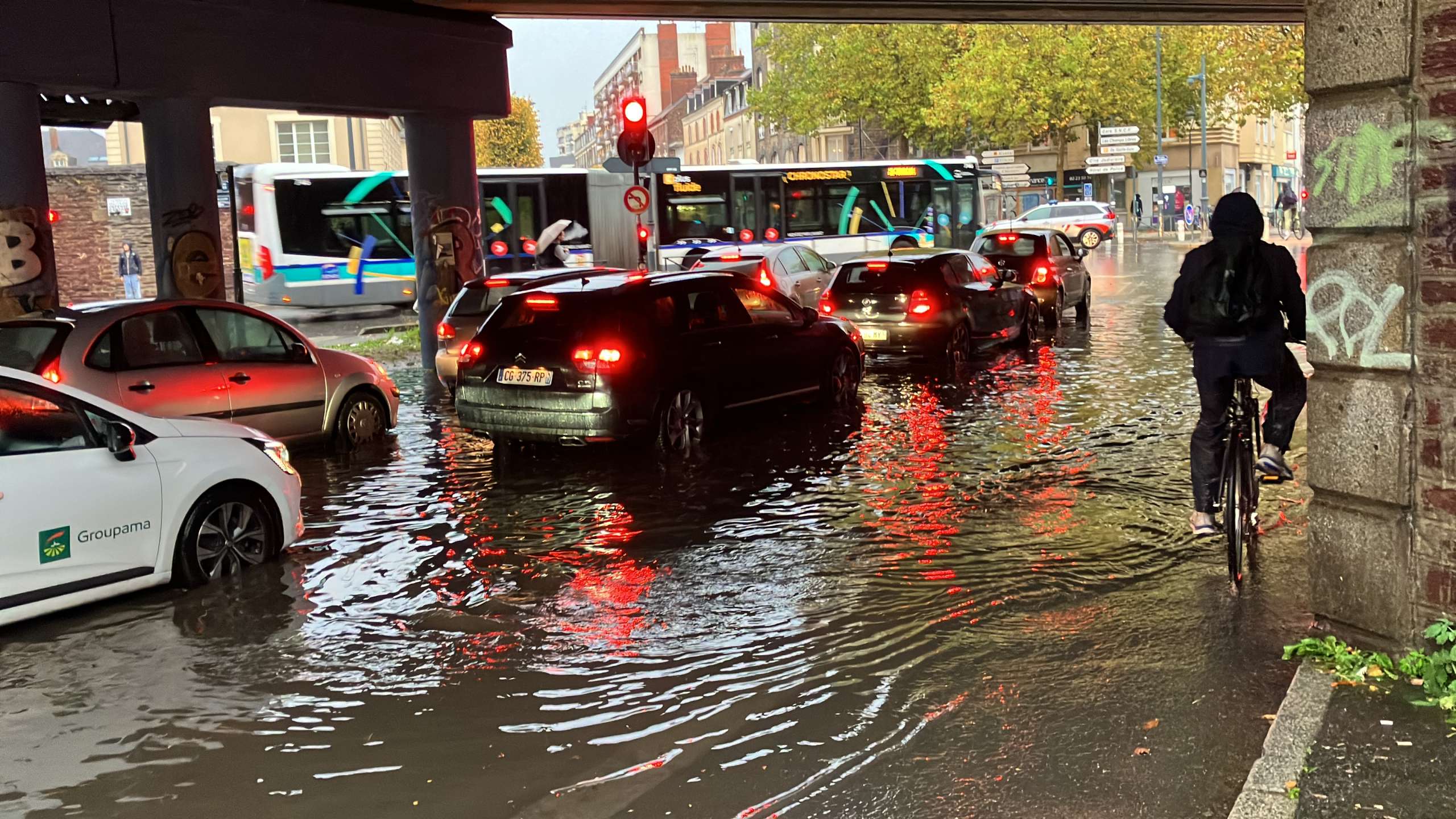 Ce 16 octobre, le météorologiste rennais Steven Tual annonçait un temps pluvio-orageux, ce mercredi en Bretagne avec des précipitations parfois soutenues. « Il est prévu entre 10 et 20 mm localement jusqu’à 30 mm sur l’est d’Ille-et-Vilaine et la Loire-Atlantique », ajoutait-il. « Quelques coups de tonnerre sont possibles. » À 18 h, des trombes d’eau ont engendré de forts ruissellements à Rennes ce soir ! Dans différents endroits de la ville, les voitures roulaient dans l’eau, en face du parc Oberthur, le long de la voie ferrée et sous le pont de Nantes. Sur la rocade, le trafic était particulièrement compliqué avec plus de 25 kilomètres de bouchons enregistrés par Bison Futé. À 19 h 15, la situation était redevenue normale sous le pont de Nantes. Les pompiers ont opéré une centaine de fois, notamment pour des caves et de sous-sols inondés. Pour en voir plus.