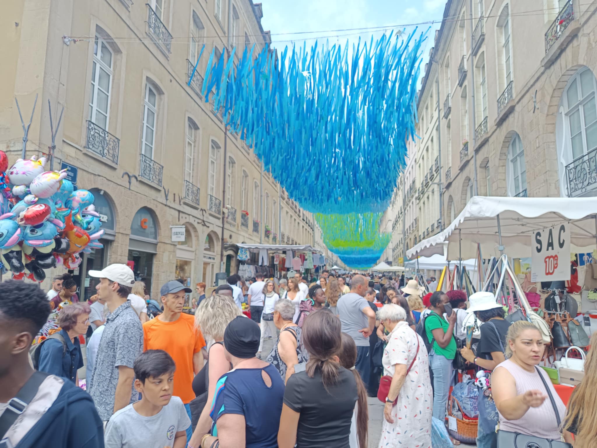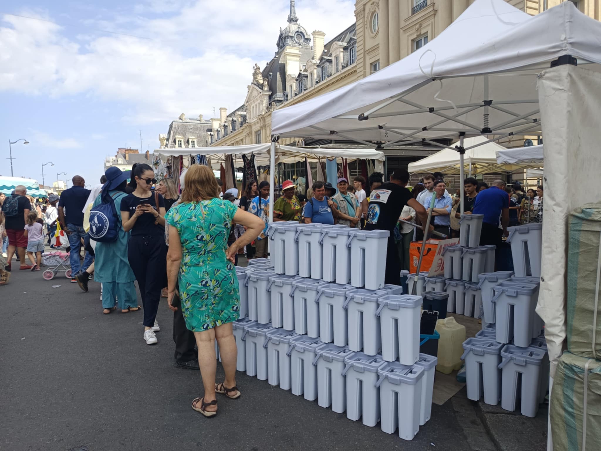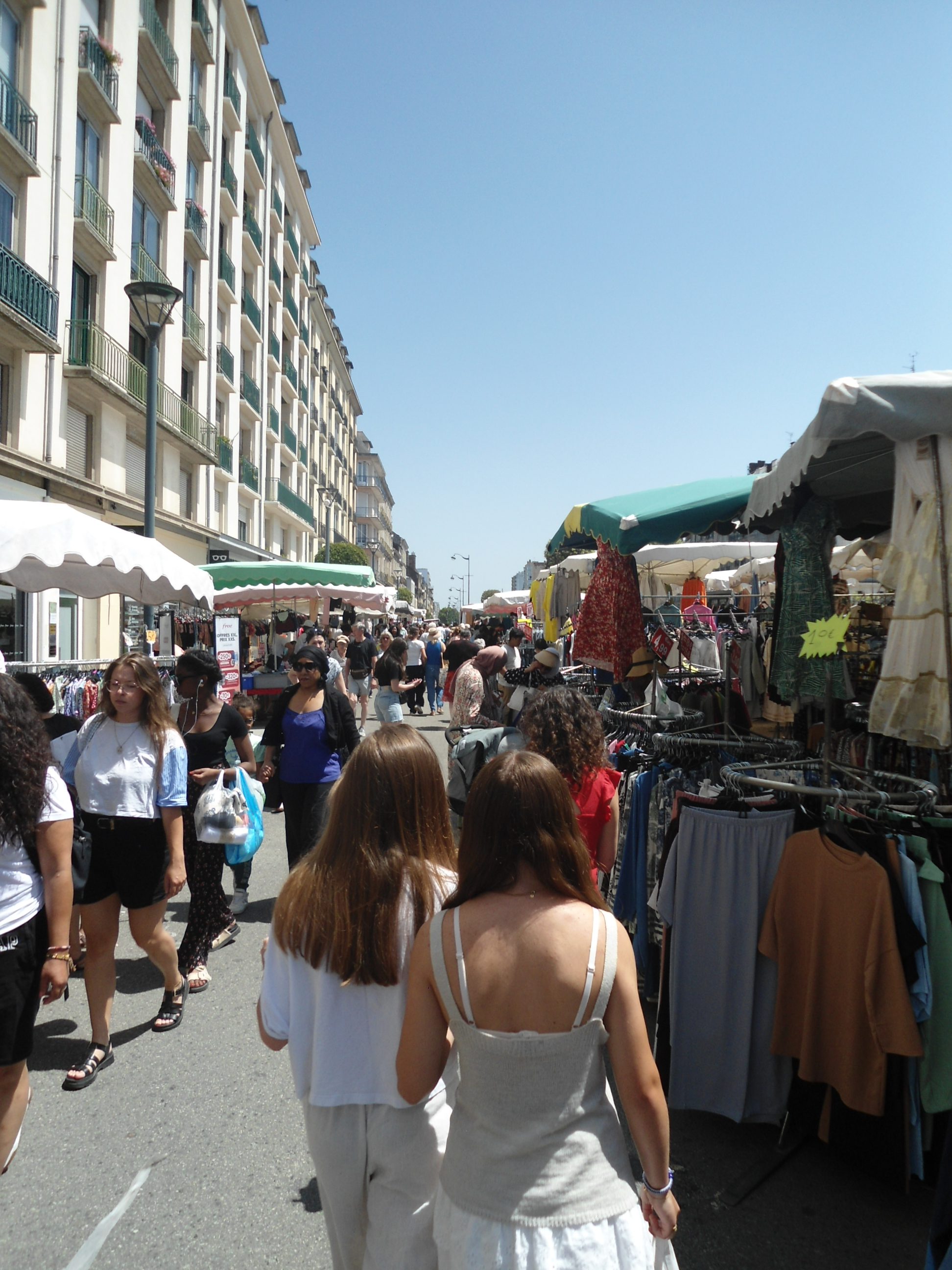 La foule était bigarrée et décontractée, venue pour fouiller, comparer, discuter, négocier. Des files se formaient autour des stands les plus courus : vêtements légers, chaussures d’été, maillots du Stade Rennais (très grands succès), produits de beauté et gadgets. Au détour d’une rue, des initiatives citoyennes offraient une pause instructive, comme le stand « Le Café de l’Europe », installé sous des tentes bleues et jaunes, ou encore les ateliers d’arts visuels animés pour les plus jeunes.
