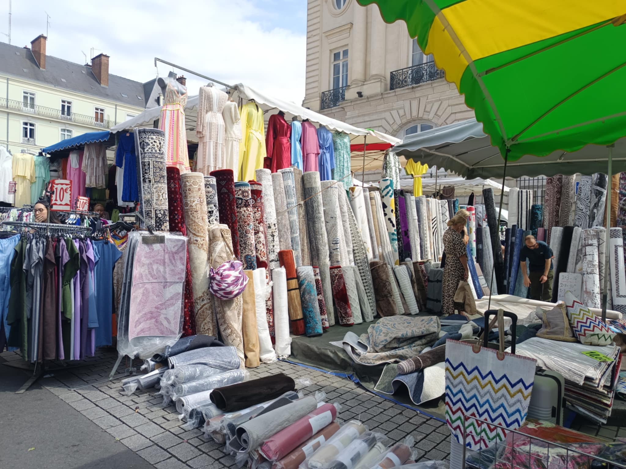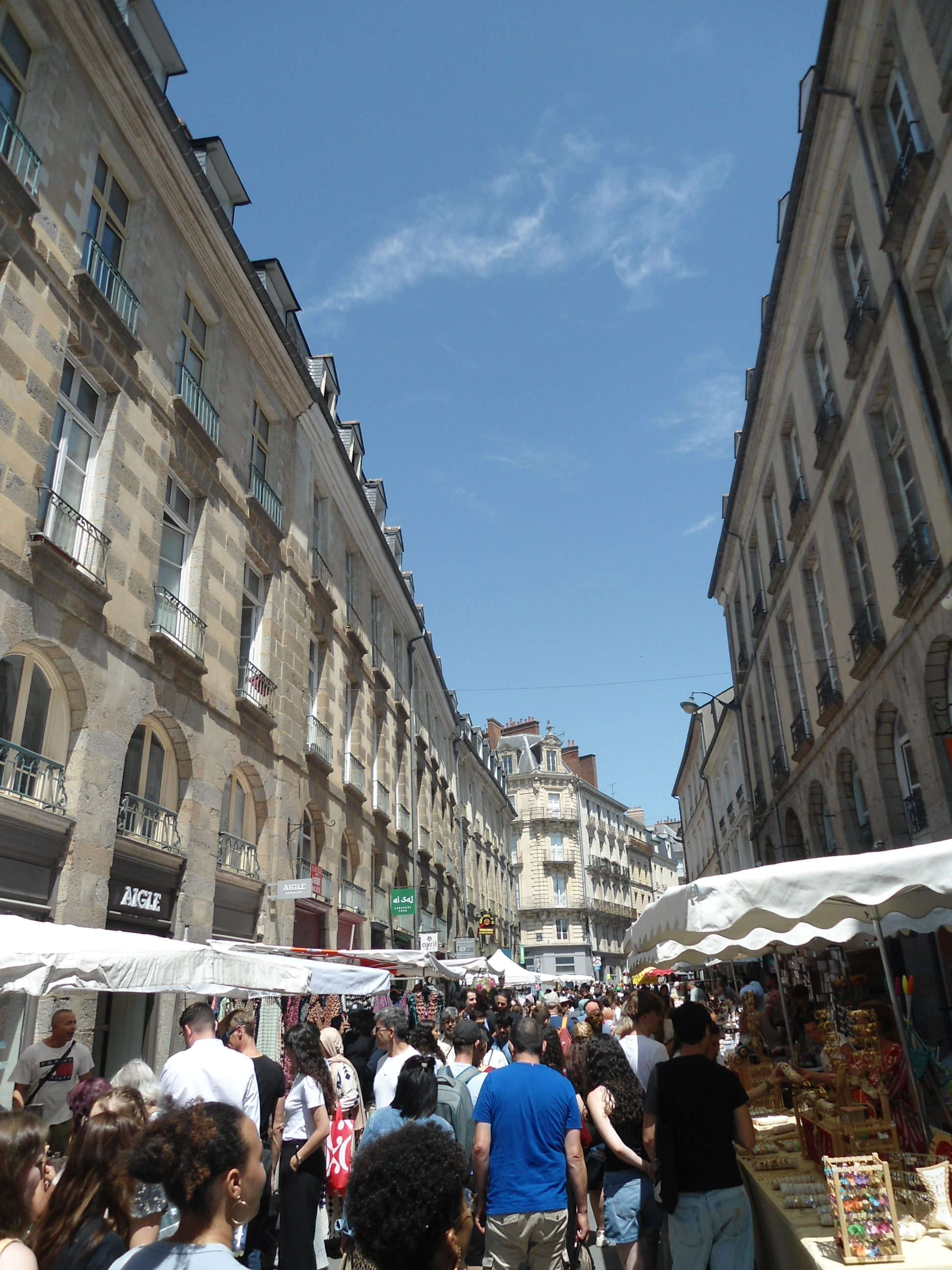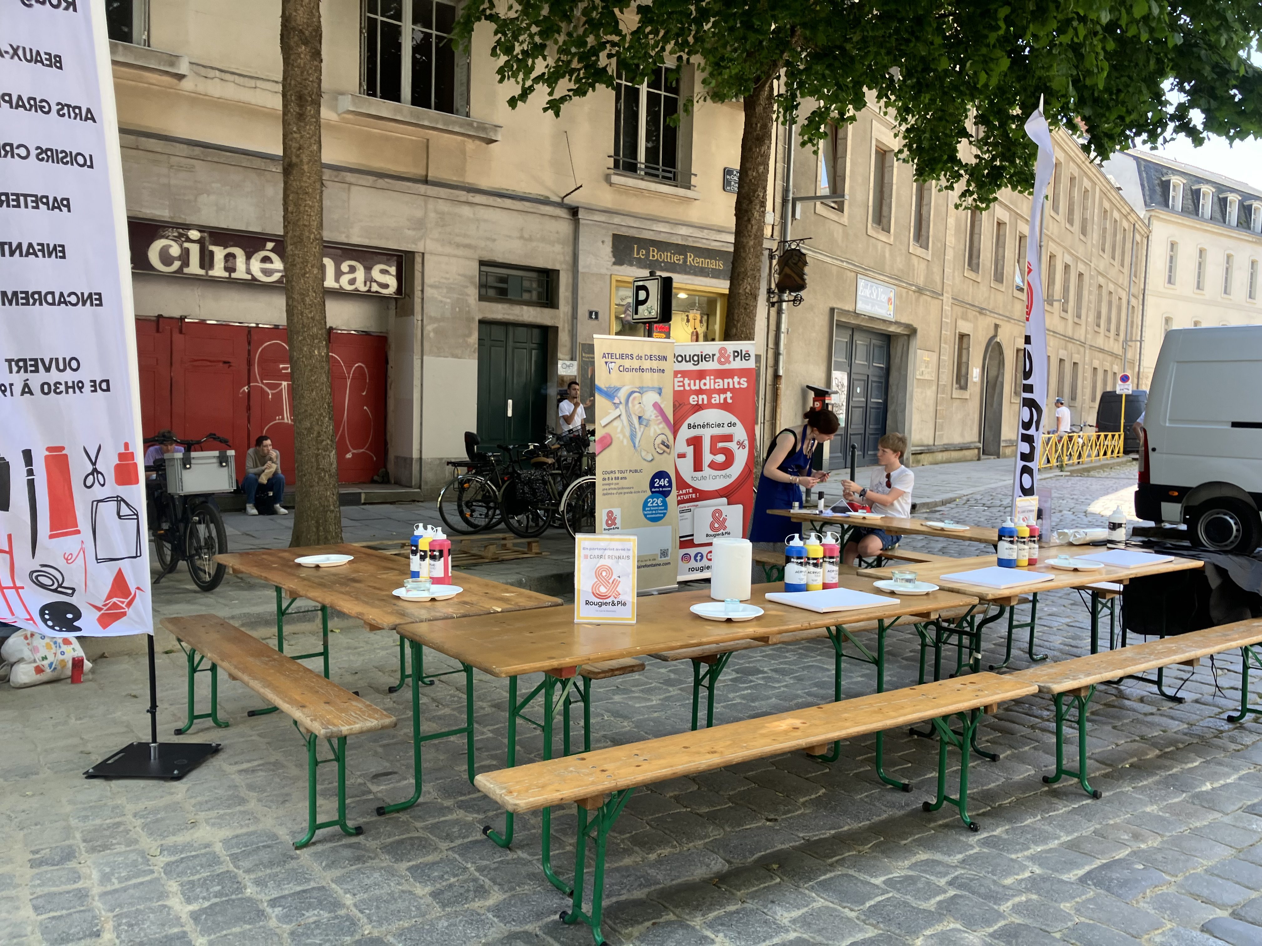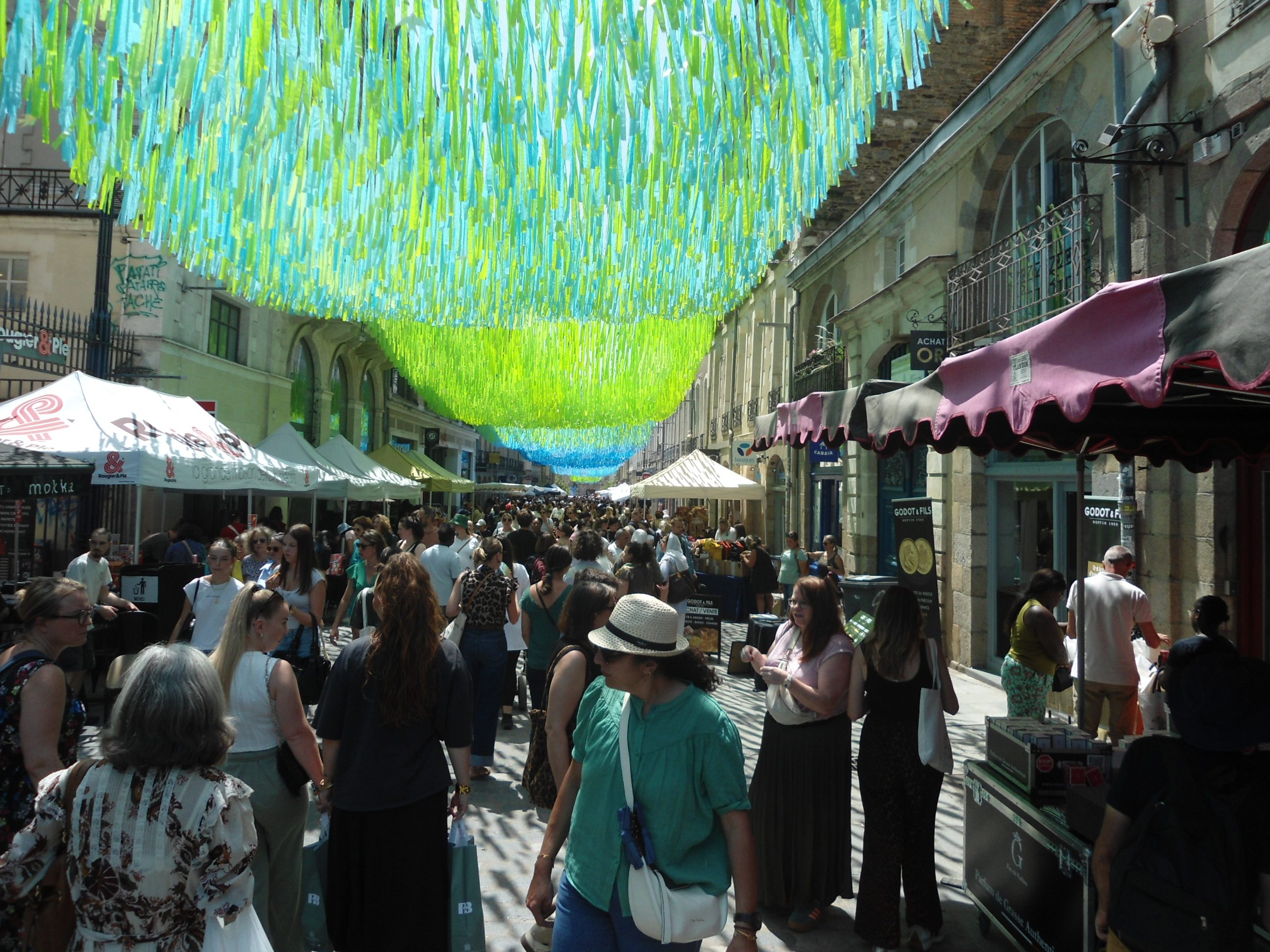 La foule était bigarrée et décontractée, venue pour fouiller, comparer, discuter, négocier. Des files se formaient autour des stands les plus courus : vêtements légers, chaussures d’été, maillots du Stade Rennais (très grands succès), produits de beauté et gadgets. Au détour d’une rue, des initiatives citoyennes offraient une pause instructive, comme le stand « Le Café de l’Europe », installé sous des tentes bleues et jaunes, ou encore les ateliers d’arts visuels animés pour les plus jeunes.
