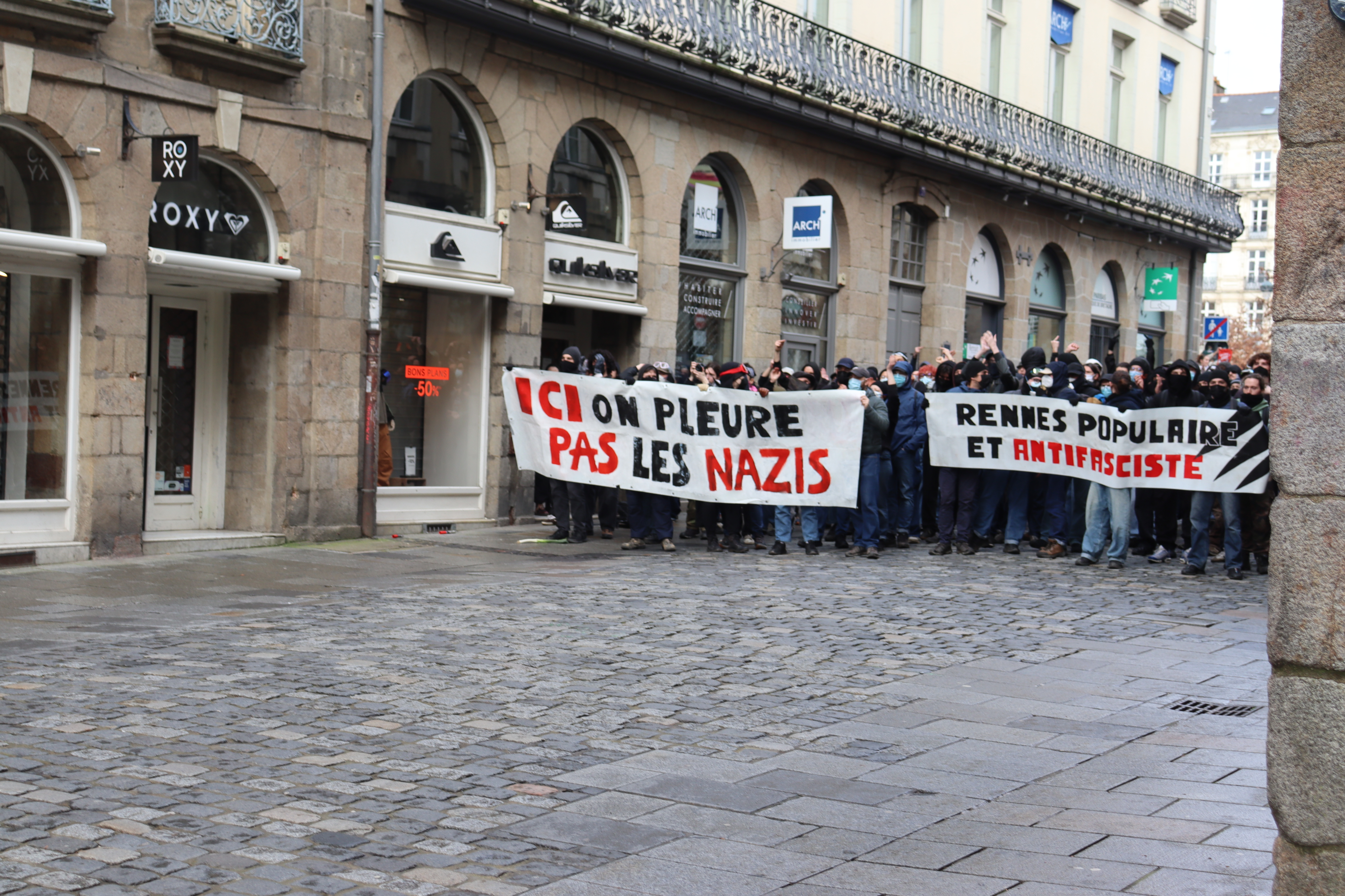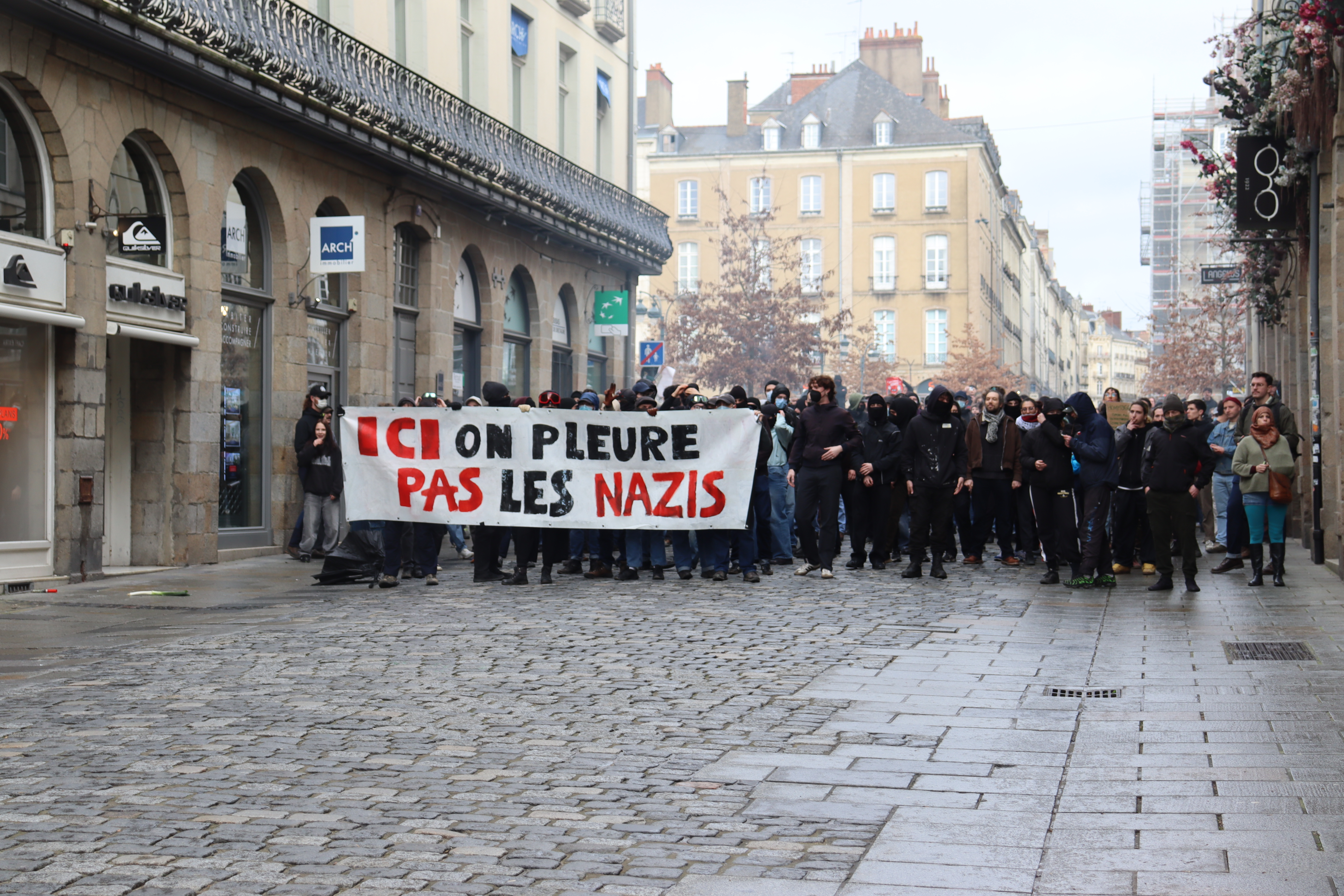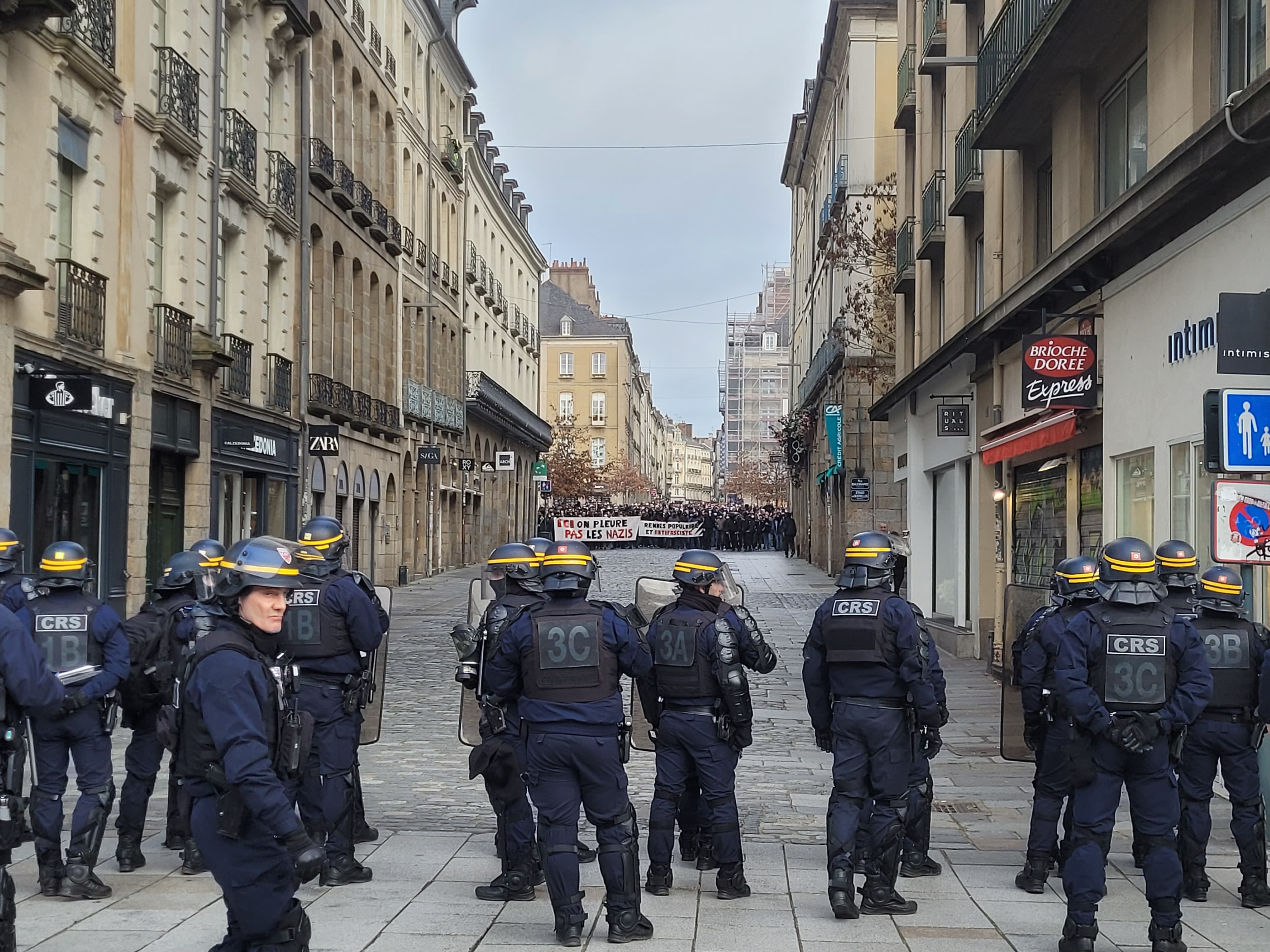 Derrière une banderole sur laquelle on pouvait lire « ici, on ne pleure pas les nazis », les ultras de gauche ont scandé plusieurs slogans : « La rue est à nous » ou encore « Rennes antifas ». En revanche, la situation s’est tendue lorsque plusieurs individus ont tenté de se diriger vers la place de la République, en dehors du périmètre autorisé.