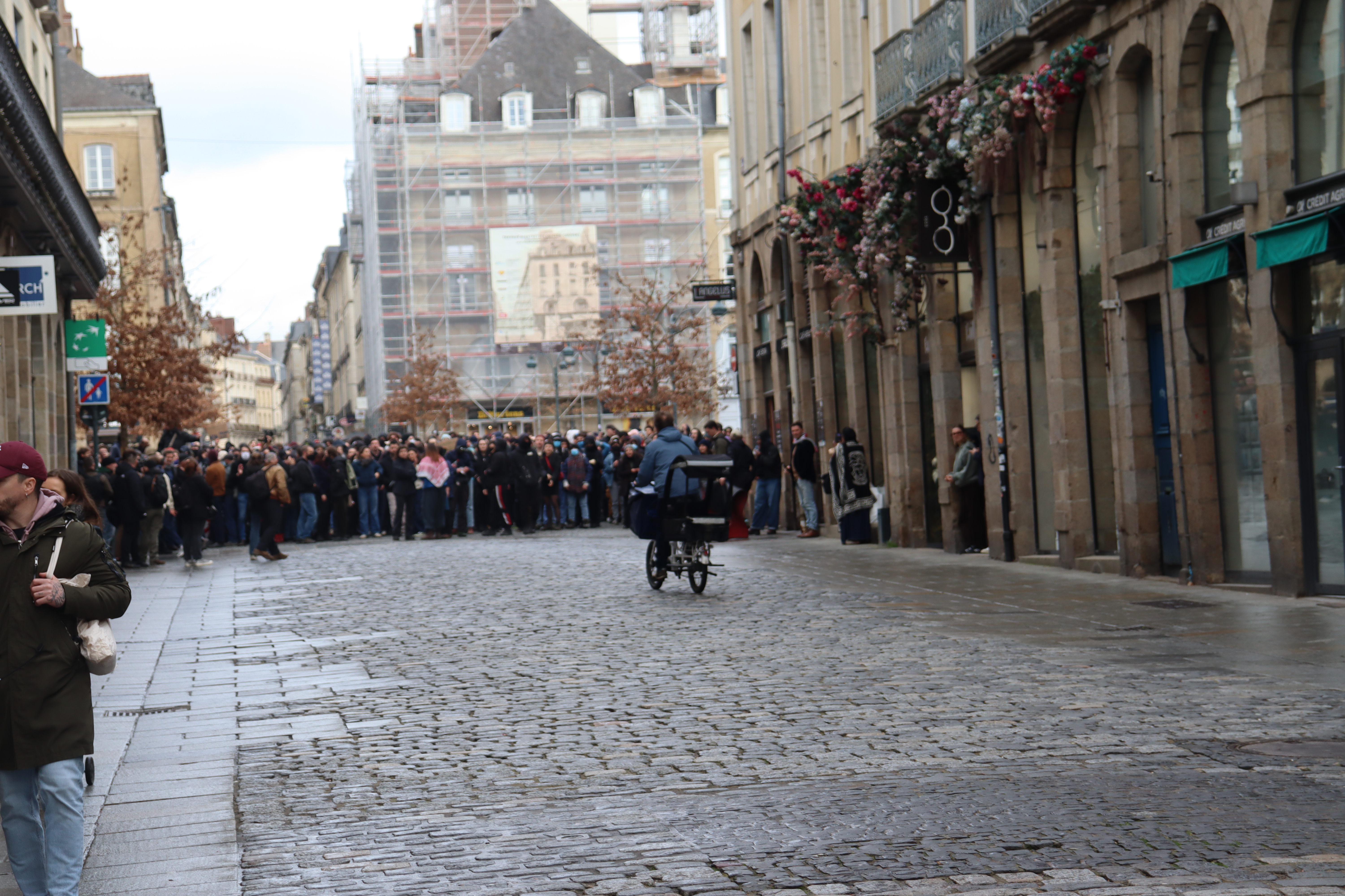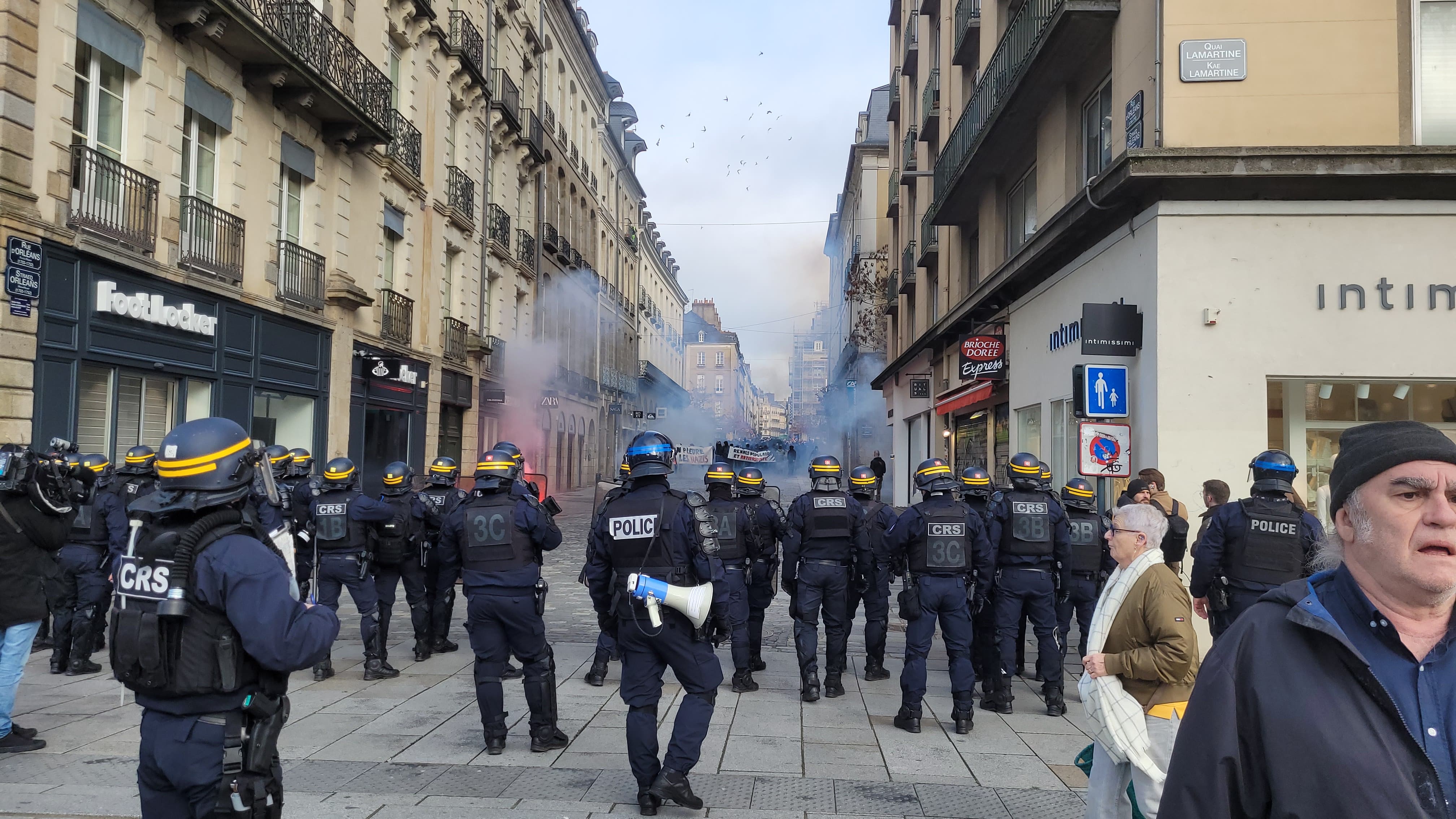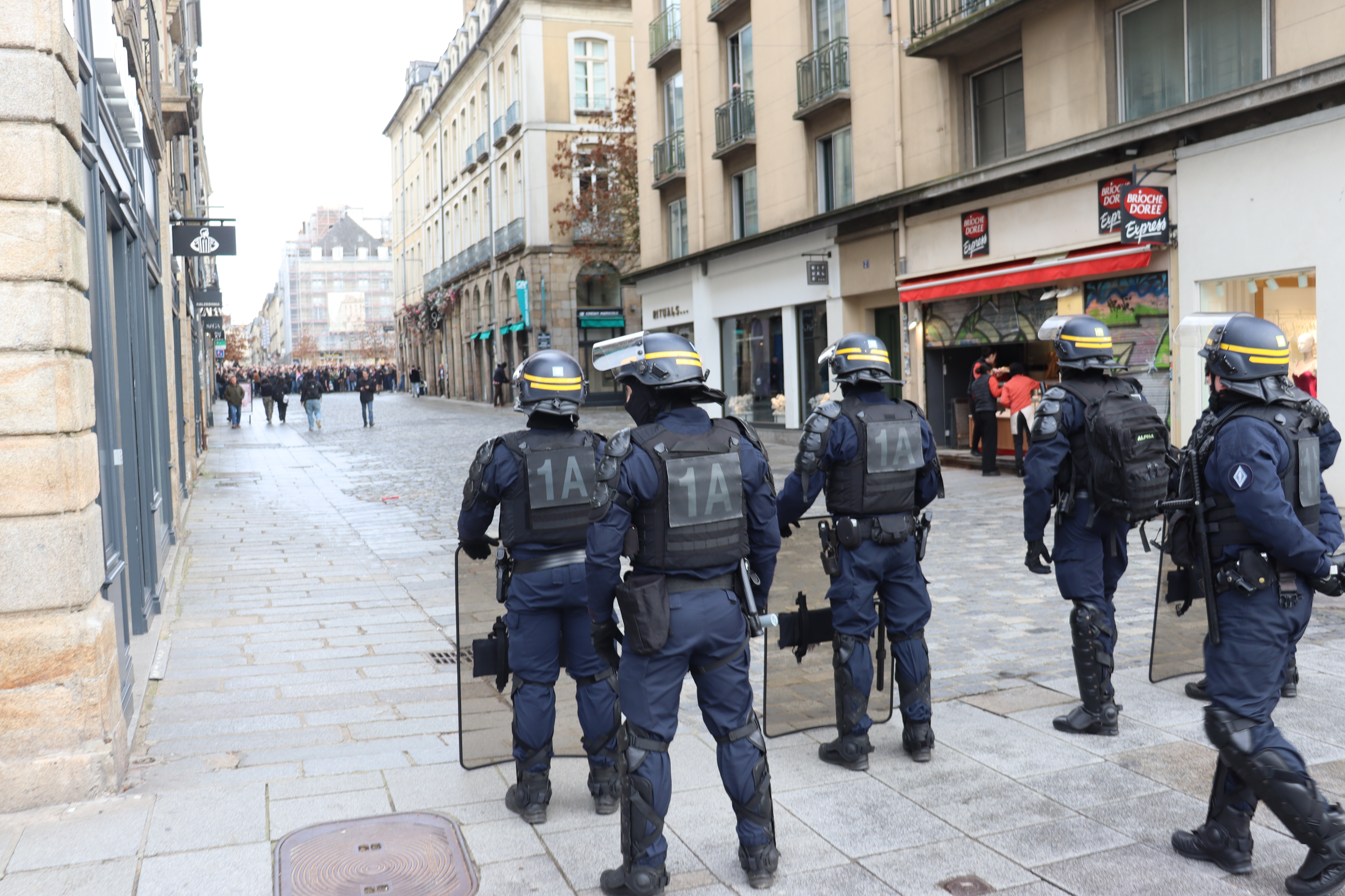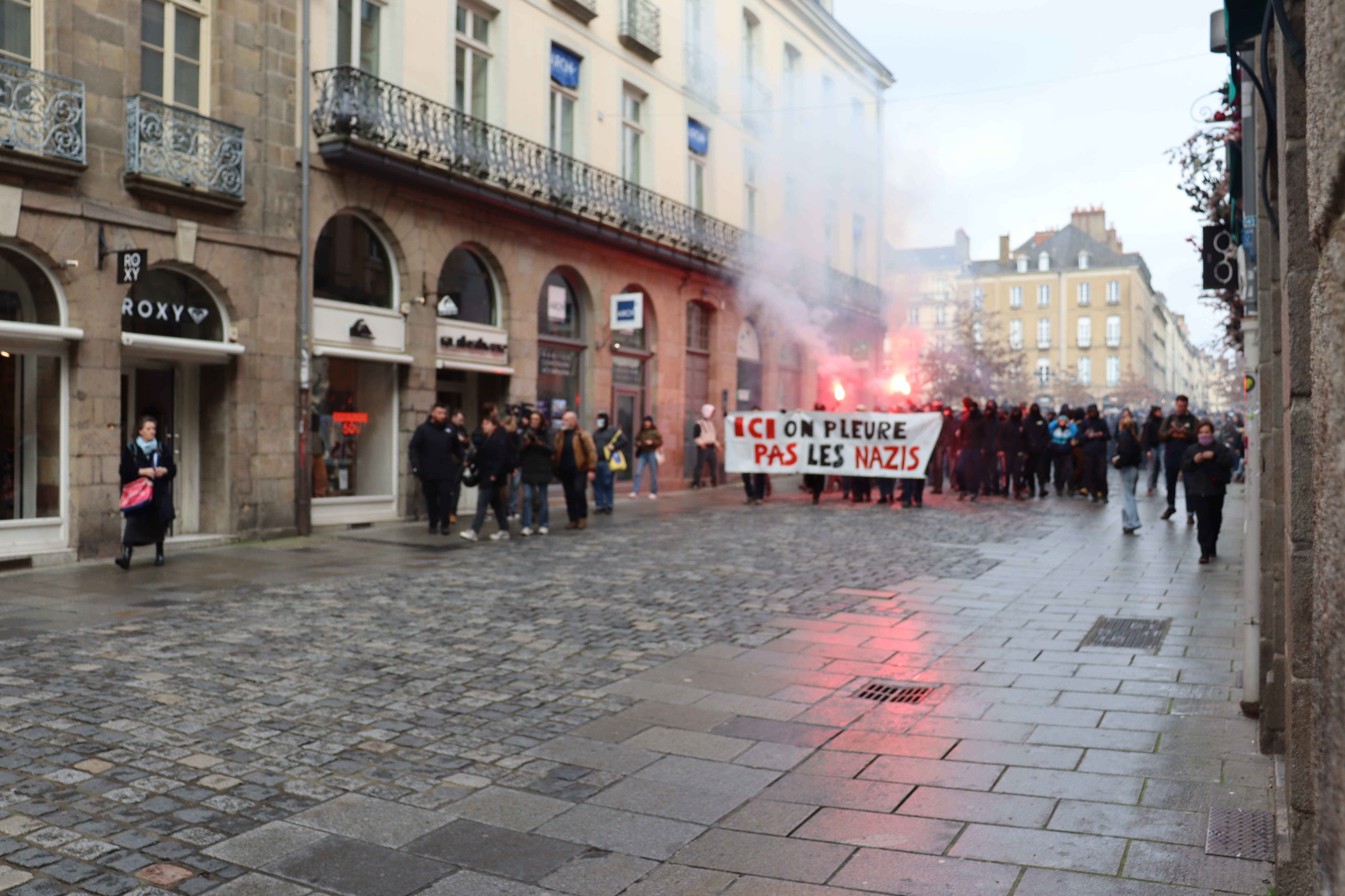 Derrière une banderole sur laquelle on pouvait lire « ici, on ne pleure pas les nazis », les ultras de gauche ont scandé plusieurs slogans : « La rue est à nous » ou encore « Rennes antifas ». En revanche, la situation s’est tendue lorsque plusieurs individus ont tenté de se diriger vers la place de la République, en dehors du périmètre autorisé.