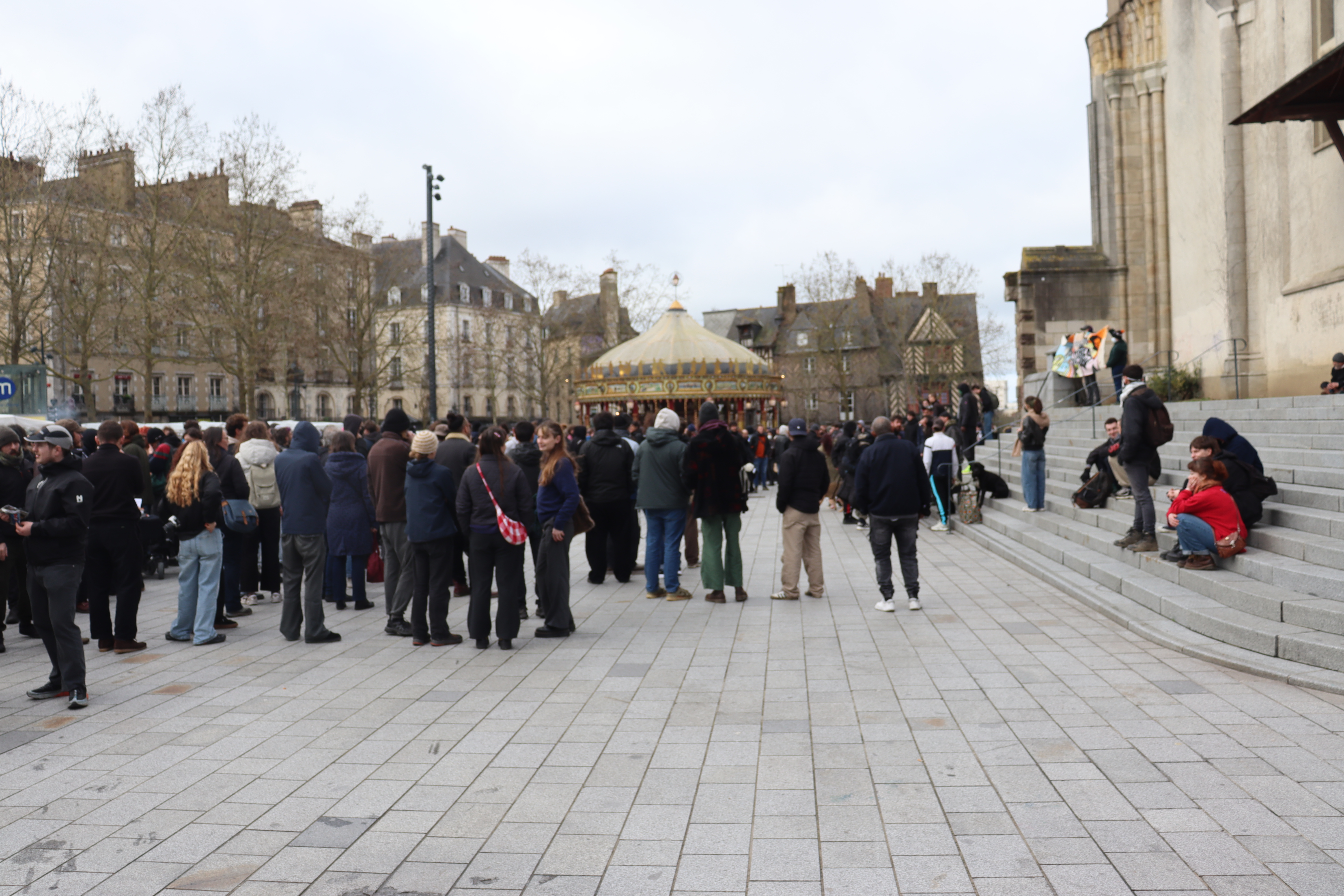 Environ 200 personnes se sont réunies place de la République à Rennes pour rendre hommage à Quentin Deranque, tué à Lyon vendredi dernier. Dans le même temps, près de 300 opposants au rassemblement se sont regroupés place de la Mairie et rue d’Orléans, sous les yeux d’un important dispositif policier.