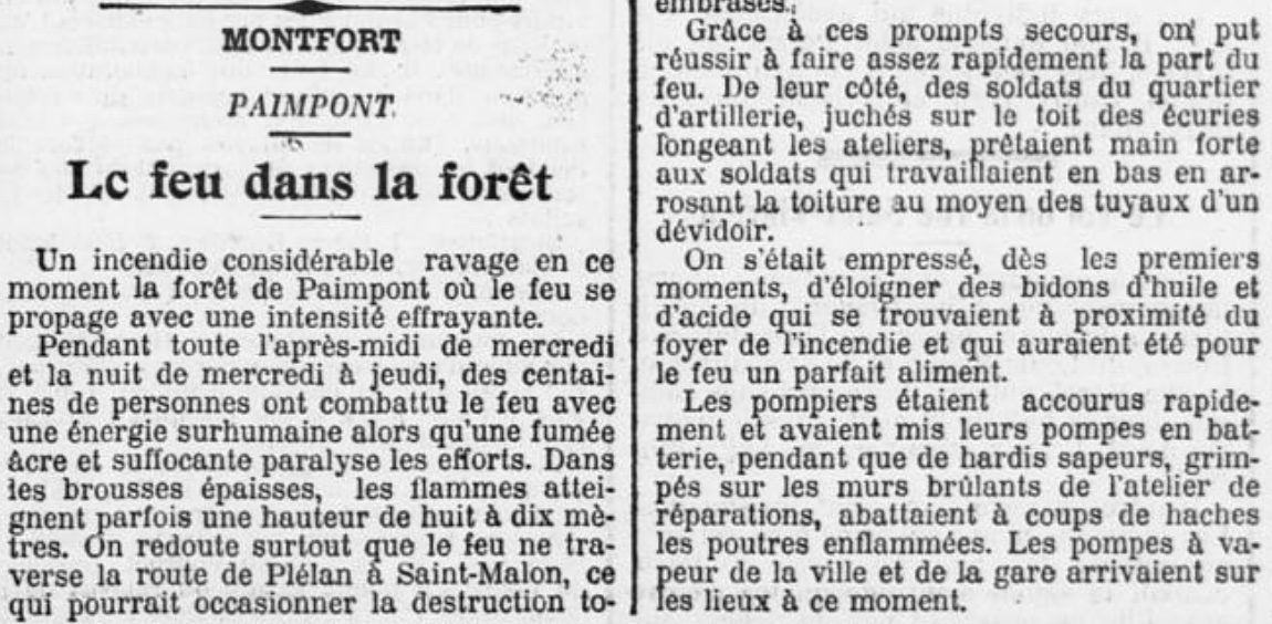 Le vendredi 28 septembre 1906, le journal Ouest-Eclair revient sur le drame. « Un incendie considérable ravage en ce moment la forêt de Paimpont où le feu se propage avec une intensité effrayante », écrivait ce jour-là le journaliste dépêché sur les lieux. Pendant toute l’après-midi de mercredi et la nuit de mercredi à jeudi, des centaines de personnes ont combattu les flammes avec « une énergie surhumaine ». « Une fumée âcre et suffocante paralyse les efforts », ajoutait le reporter. Dans les brousses épaisses, les flammes atteignent parfois une hauteur de huit à dix mètres. « On redoute surtout que le feu traverse la route de Plélan à Saint-Malon, ce qui pourrait occasionner la destruction totale de la forêt. Environ 500 ha, d’après des appréciations approximatives, seraient déjà ravagés sur une superficie de 6000 hectares. Des troupes ont été demandées à Rennes pour combattre le fléau. Elles sont parties hier soir par le tramway de Plélan », précisait le quotidien.