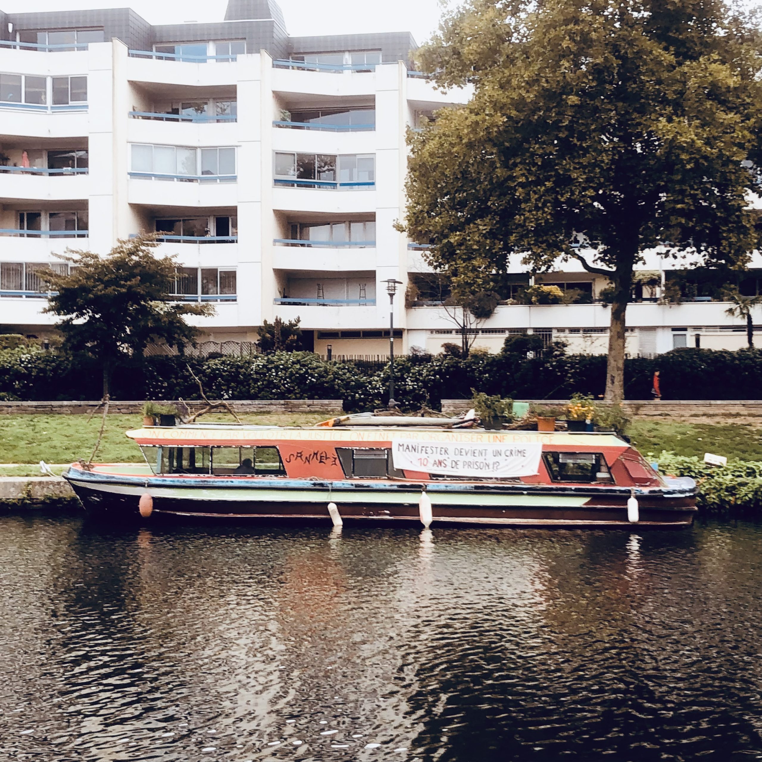 À Rennes, il y a la péniche spectacle, la péniche-yoga et la péniche-musette (toujours fermée). Mais ces derniers jours, les riverains du Mail ont eu la surprise de voir une péniche-révolutionnaire. « On commence par vouloir la justice, on finit par organiser une police » affichait la banderole, le long de la coque. « Manifester devient un crime, 10 ans de prison ? », ajoutait la seconde. Derrière ces énigmatiques slogans, impossible de connaître les raisons du capitaine. Il avait filé vers d’autres horizons. La révolution se fait aussi sur l’eau. C’était le cuirassé Pontemkine en version rennaise !
