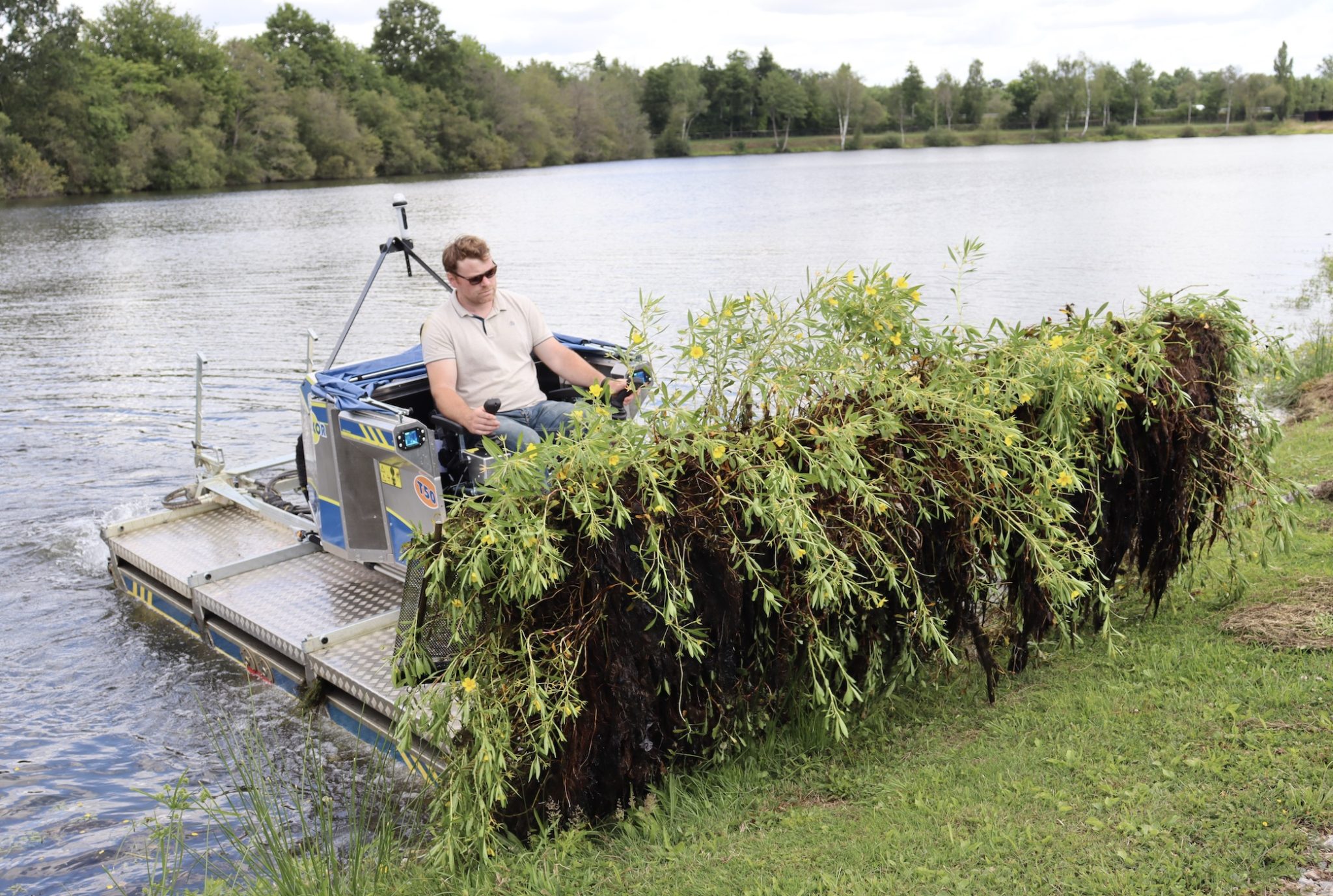 À Goven, ce jour-là, dans une magnifique propriété, le jeune homme a de quoi faire. Devant lui s’étendent des mares sur une vingtaine d’hectares où une plante revient subrepticement tous les ans. Sans hésiter, le Bruzois démarre son engin. Sur le sol meuble, il avance difficilement, mais une fois sur l’étang, la machine est comme un poisson dans l’eau. Elle arrache les « invasifs » d’un coup de pelle mécanique, avant de regagner les berges pour déposer sa récolte.