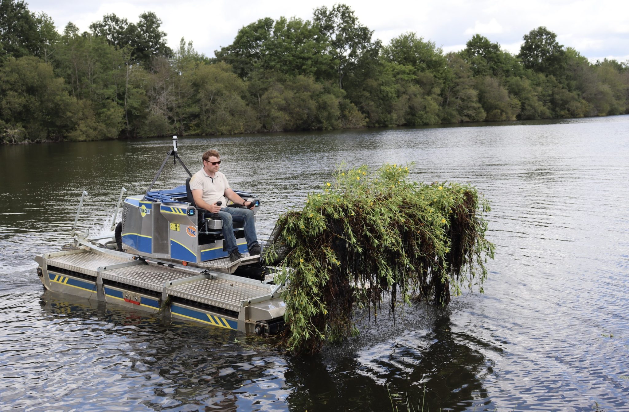 À Goven, ce jour-là, dans une magnifique propriété, le jeune homme a de quoi faire. Devant lui s’étendent des mares sur une vingtaine d’hectares où une plante revient subrepticement tous les ans. Sans hésiter, le Bruzois démarre son engin. Sur le sol meuble, il avance difficilement, mais une fois sur l’étang, la machine est comme un poisson dans l’eau. Elle arrache les « invasifs » d’un coup de pelle mécanique, avant de regagner les berges pour déposer sa récolte.