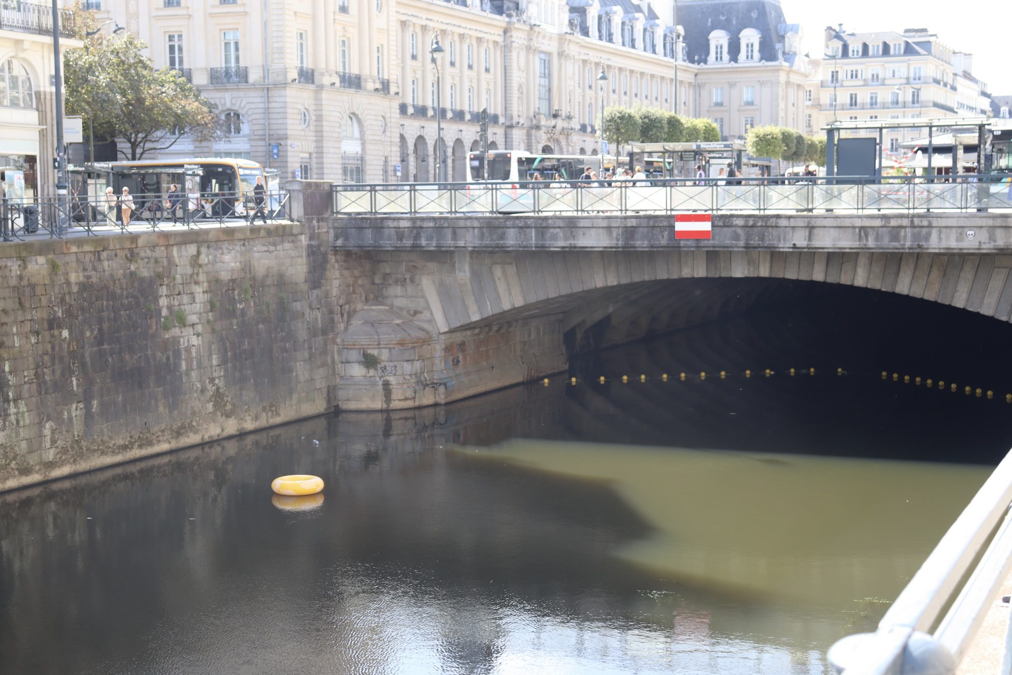 Elle flotte sur la Vilaine, aux pieds de la place de la République. Une bouée jaune. Comme un symbole. D’où vient-elle ? On aime imaginer qu’elle a été abandonnée par les ultras de la dernière manifestation du 18 septembre qui ont pris l’habitude d’ouvrir leurs cortèges avec des objets gonflables, comme des totems. De couleur jaune — comme les gilets — va-t-elle venir au secours de la République ? Du Premier ministre sans gouvernement ? Des protestataires qui crient « Bloquons tout » ?