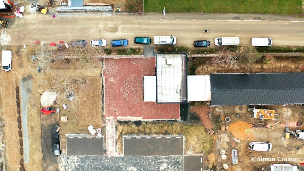 En écho à l’architecture industrielle des nouveaux bâtiments du quartier, les briques ont été posées en novembre 2020 avec l’équipe de Keravis (entreprise de travaux publics) sur une surface de 120 m2 devant le Pavillon Courrouze. En quelques jours, elles ont formé une composition ornementale digne de plus grands monuments de la ville.