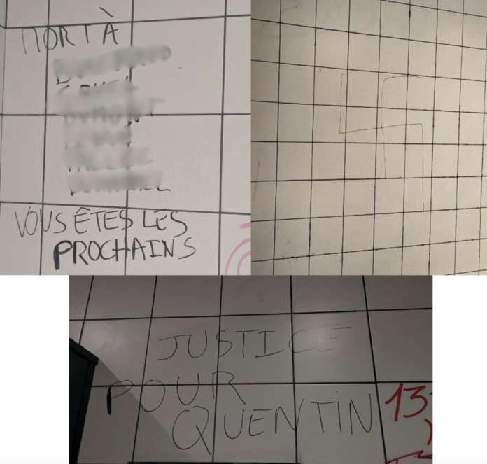 Ce 18 février, à l’université Rennes 2, des inscriptions ont été découvertes sur les murs du campus par les militants du mouvement de Jean-Luc Mélenchon. « Les noms de militants antifascistes, dont deux insoumis rennais, y étaient visés. Il s’agit de mon suppléant ainsi que d’une candidate sur la liste que je porte pour les élections municipales », explique la députée Marie Mesmeur sur X. « L’inscription précise exactement : mort à (xxx) (xxxx) (xxxx), précédée de l’inscription “Justice pour Quentin”. A proximité figuraient également une croix gammée ainsi que la phrase “Le Jarl vous salue”, en référence à un influenceur d’extrême droite qui profite des événements pour attiser la haine en fichant des militants. »