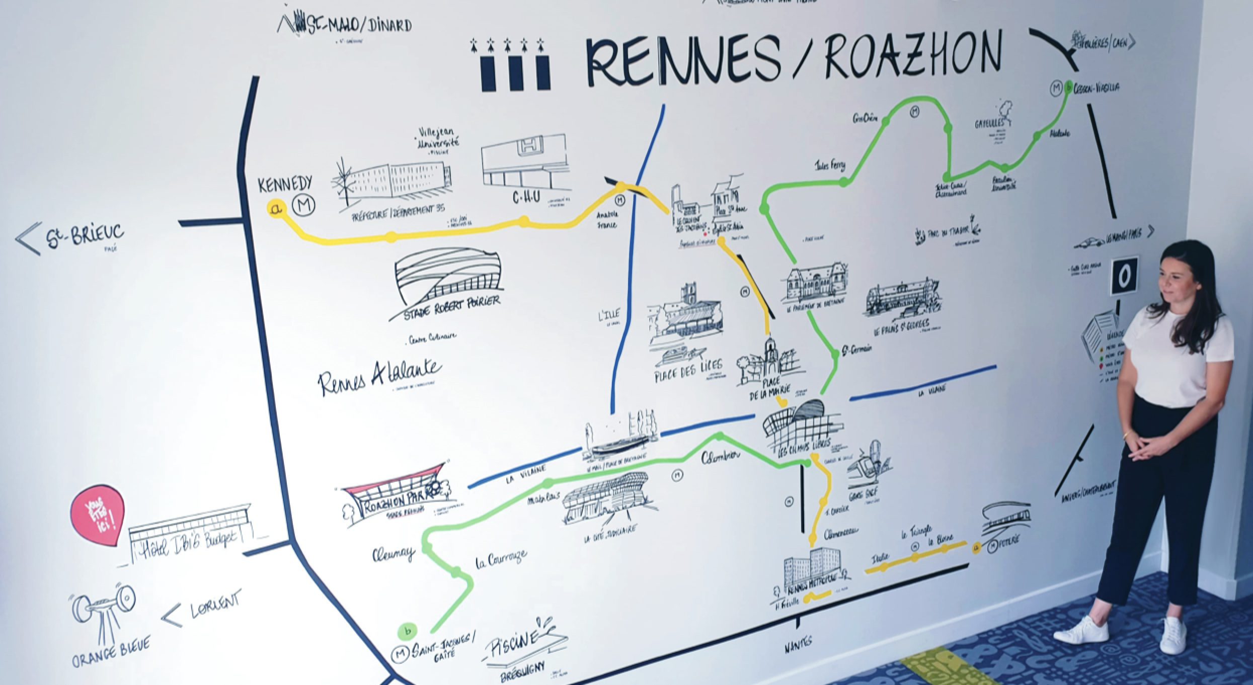 Après l’ouverture de la ligne b Saint-Jacques-Cesson, Jean-Paul Chapin, propriétaire de l’Hôtel Ibis Budget (route de Lorient), a demandé à l’illustratrice rennaise Justine Prigent la mise à jour de sa fresque de 12 m² du plan de Rennes métropole, réalisée en 2019.