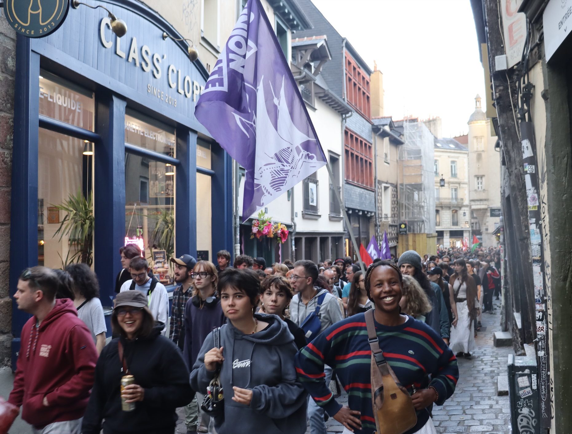 Dans une ambiance qui tenait autant du rassemblement militant que d’une fête populaire, la foule regroupait des étudiants de l’Union pirate, des militants de Révolution permanente et de La France insoumise, des militants d’Attac, mais aussi du NPA. Très vite, la concentration « statique » s’est muée en cortège. Peu avant 20 heures, les manifestants ont pris la direction de la place Sainte-Anne.