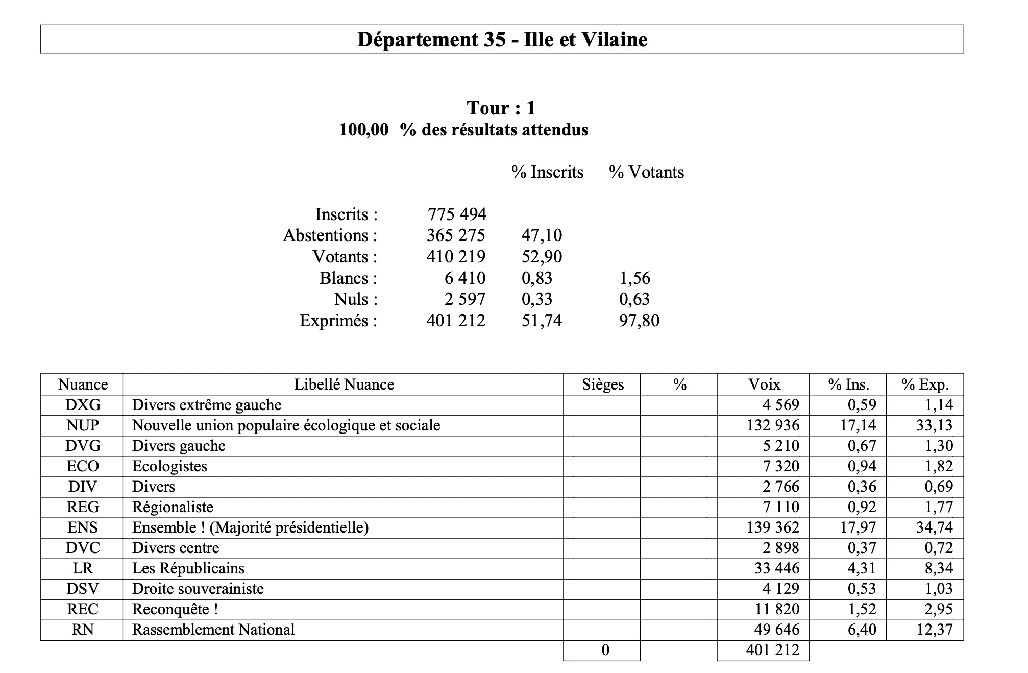 Avec un taux d’abstention à 47, 10 %, le département d’Ille-et-Vilaine ne s’est pas particulièrement mobilisé pour ce premier tour des législatives. Le mouvement Ensemble (Macron) arrive en tête avec 34, 74 %, devant Nupes (33, 13 %), le Rassemblement national (12, 37 %) et les Républicains (8, 34 %). Reconquête (2, 95 %) et les écologistes (1, 82 %).