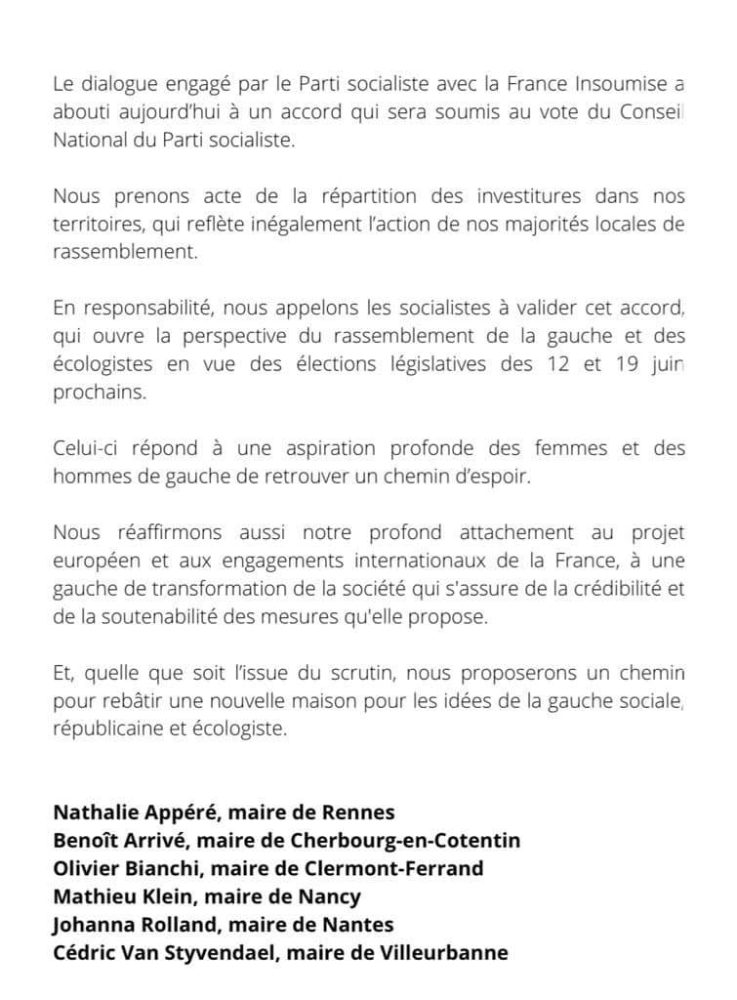 En responsabilité, mais résignée, l’élue rennaise appelle tous à valider cet accord. « Il ouvre la perspective du rassemblement de la gauche et des écologistes en vue des élections législatives des 12 et 19 juin prochains », ajoute-t-elle dans un communiqué publié ce soir sur la page Facebook et écrit notamment avec la maire de Nantes. « Il répond à une aspiration profonde des femmes et des hommes de retrouver un chemin d’espoir. »