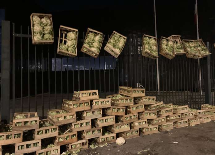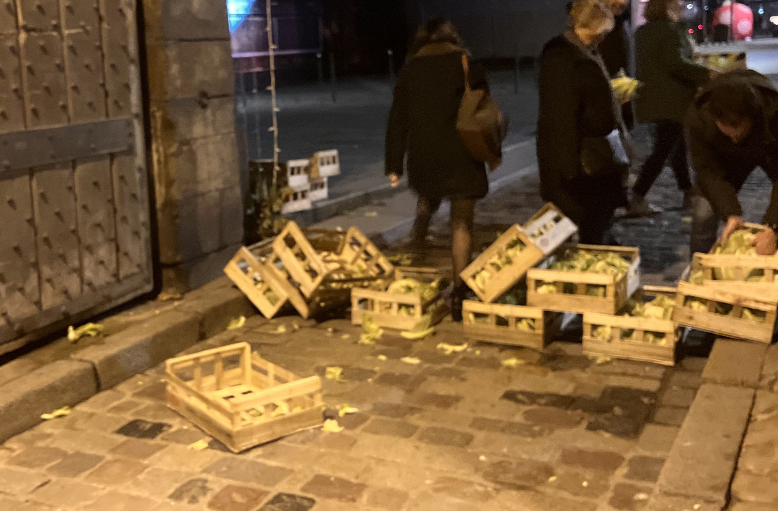 Après un premier arrêt Intra-Muros, le cortège s’est dirigé vers la sous-préfecture où là encore, les cagettes ont été empilées contre les grilles, certaines même suspendues.  Vers 23 h, les services municipaux ramassaient encore les légumes abandonnés devant la sous-préfecture. « On va voir ce qu’on peut en faire. Peut-être les donner à des associations », indiquait un agent. Sous la porte Saint-Vincent, quelques passants repartaient déjà avec une cagette sous le bras.