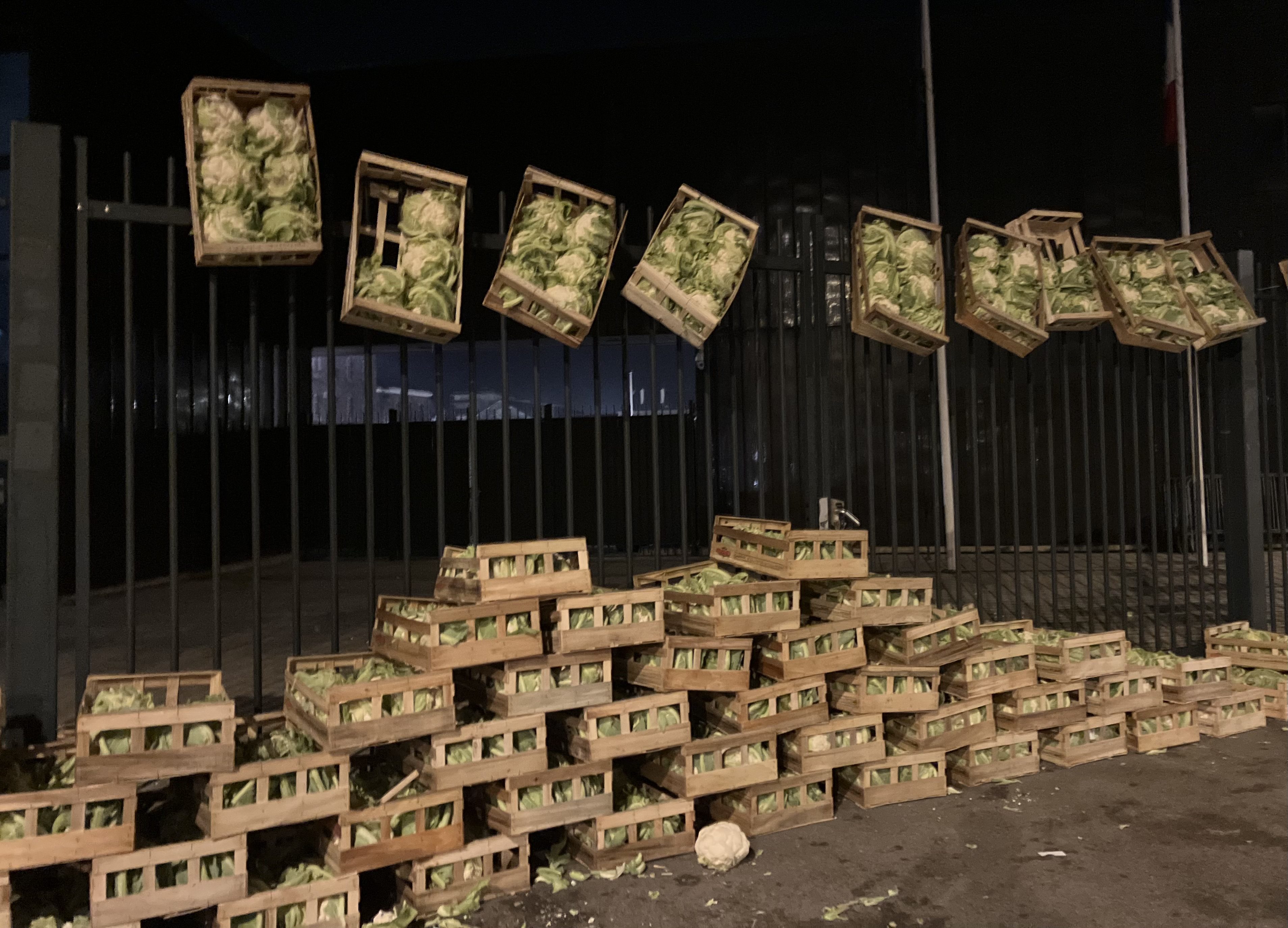 A l’occasion de la visite d’Emmanuel Macron ce 10 décembre à Saint-Malo venu à la rencontre des lecteurs du journal Ouest-France, la quiétude de la cité corsaire a été rompue par le ronflement des moteurs. En début de soirée, une file de tracteurs a traversé les rues de la ville avant de s’arrêter sous la porte Saint-Vincent où des cagettes de choux-fleurs ont été rapidement déversées au pied des remparts.