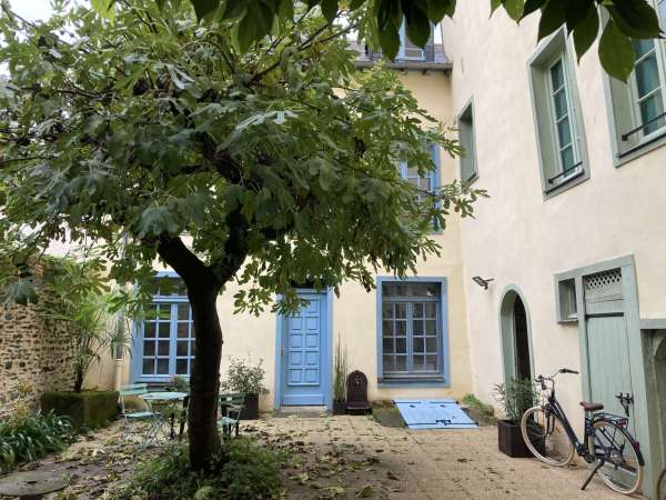 Au numéro 28 de la rue Saint-Georges, l’entrée bleue en bois laisse place à un grand couloir éclairé par des lumières douces. Elle mène vers un petit abreuvoir tout noir où un robinet en cuivre laisse quelquefois filer des gouttelettes d’eau. Dans cette étrange arrière-cour pavée, le bruit de la ville est bien loin et la quiétude est assurée. A l’écart, le chemin se poursuit vers un escalier en bois comme on en déniche partout dans le cœur de Rennes. Mais pas le temps de monter quatre à quatre vers les plus hauts sommets, un autre long couloir s’enfonce dans les entrailles de notre belle cité. Il mène vers un petit bonheur urbain au milieu duquel les feuilles d’automne éparpillées sur le sol donnent à l’endroit un air champêtre. Ici, un banc en granit attend un noble séant. Là, une cour majestueuse sort de nulle part devant les yeux ébahis!