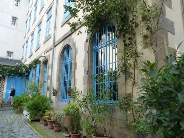 À deux pas de la basilique Notre-Dame des Miracles, la cour de la rue Saint-Sauveur reste accessible. On y trouve les presbytères de Saint-Vincent et de Saint-Melaine, quelques maisons aux volets bleus, une végétation douce, et des pavés qui accrochent la lumière. Ici, le charme est encore à portée de pas. C’est aussi le cas Rue Vasselot. Derrière la porte du Batchi, des vestiges du couvent des Carmes sont encore visibles aujourd’hui dont une étonnante maison à pans de bois avec un double escalier à balustres donnant sur des logements à galeries.