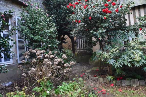 Au numéro 28 de la rue Saint-Georges, l’entrée bleue en bois laisse place à un grand couloir éclairé par des lumières douces. Elle mène vers un petit abreuvoir tout noir où un robinet en cuivre laisse quelquefois filer des gouttelettes d’eau. Dans cette étrange arrière-cour pavée, le bruit de la ville est bien loin et la quiétude est assurée. A l’écart, le chemin se poursuit vers un escalier en bois comme on en déniche partout dans le cœur de Rennes. Mais pas le temps de monter quatre à quatre vers les plus hauts sommets, un autre long couloir s’enfonce dans les entrailles de notre belle cité. Il mène vers un petit bonheur urbain au milieu duquel les feuilles d’automne éparpillées sur le sol donnent à l’endroit un air champêtre. Ici, un banc en granit attend un noble séant. Là, une cour majestueuse sort de nulle part devant les yeux ébahis!