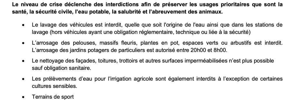 Les services de l’État se mobilisent pour assurer la bonne application des restrictions et interdictions. « Les contrôles du respect des mesures de restriction ou d’interdiction des usages se poursuivent, pour l’ensemble des usagers de l’eau. Face à cette situation qui s’aggrave et aux fortes chaleurs actuelles, chacun, résident, touriste, industriel, collectivité, exploitant agricole, est appelé à respecter les mesures de restriction indispensables pour ne pas aggraver la situation. Chacun est invité à réduire, dès à présent et de manière volontaire, sa consommation en eau au quotidien et à se tenir informé des évolutions prochaines en matière de restriction », indique la préfecture. Pour connaître en temps réel les mesures de restriction ou d’interdiction applicables par commune et en fonction de la ressource utilisée et des usages.