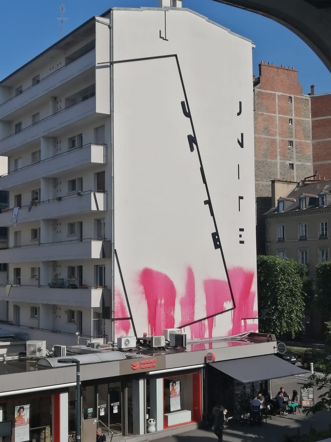 En se levant ce matin, ce samedi 4 juin 2022, la riveraine Sophie n’en croyait pas ses yeux. En face de chez elle, rue Tronjolly, l’Unité de la, sculpture de l’artiste américain minimaliste Peter Downsbrough, était en partie recouverte d’un rose pétant. « On ne sait même pas ce qu’ils ont voulu dire ! », dénonce-t-elle. Situé sur le pignon d’un immeuble, le mot « Unité » y est divisé en deux parties, s’opposant alors à sa propre définition. À deux pas de là, un autre mur d’immeuble était également dégradé, ce matin. Fait à noter, l’oeuvre d’art de la Tour d’Auvergne (réalisée dans le cadre de Teenage Kicks) a subi le même sort, depuis quelques mois.