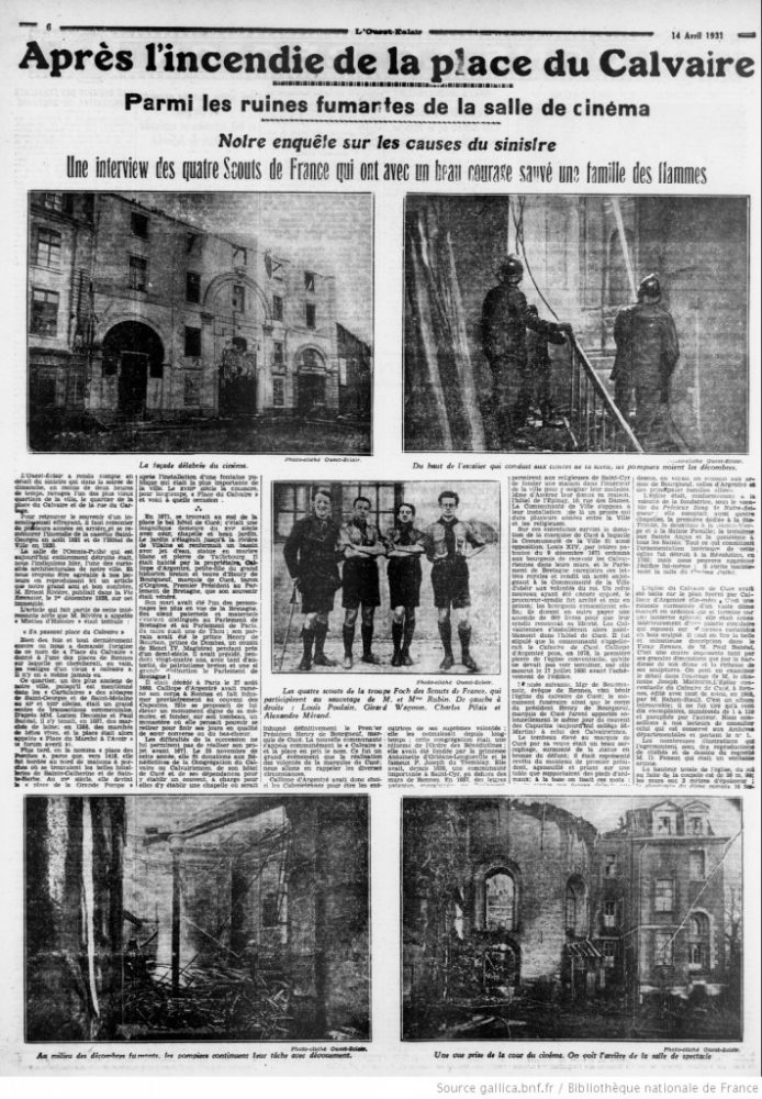 Heureusement, quatre scouts Gérard Woyon, Louis Poulain, Charles Pilais et Alexandre Mirand intervenaient promptement. L’un d’eux accrocha son lasso à l’appui d’une fenêtre et l’enfant du couple enroulé dans des couvertures fut descendu par la corde. « Saisissant ensuite sa femme, ajoute le journal Ouest-Eclair, M. Rubin se suspendit dans le vide et commença sa descente. Il arriva ainsi jusqu’au sol, résistant courageusement aux brûlures que les flammes s’échappant par les fenêtres brisées, lui faisaient aux mains. »