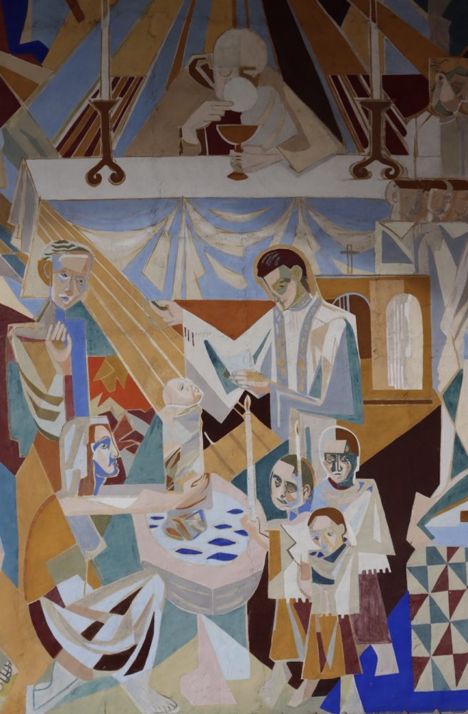 À gauche, l’on aperçoit saint Pierre et les flammes de l’Enfer. À droite, l’on devine les sacrements (Le Baptême, L’Eucharistie, La Confirmation, La Pénitence et la Réconciliation, L’Extrême-onction, L’Ordination et Le Mariage). Petite anecdote : le peintre s’est dessiné lui-même en marié et a représenté les membres de sa famille. L’oeuvre murale a été restaurée en 2014.