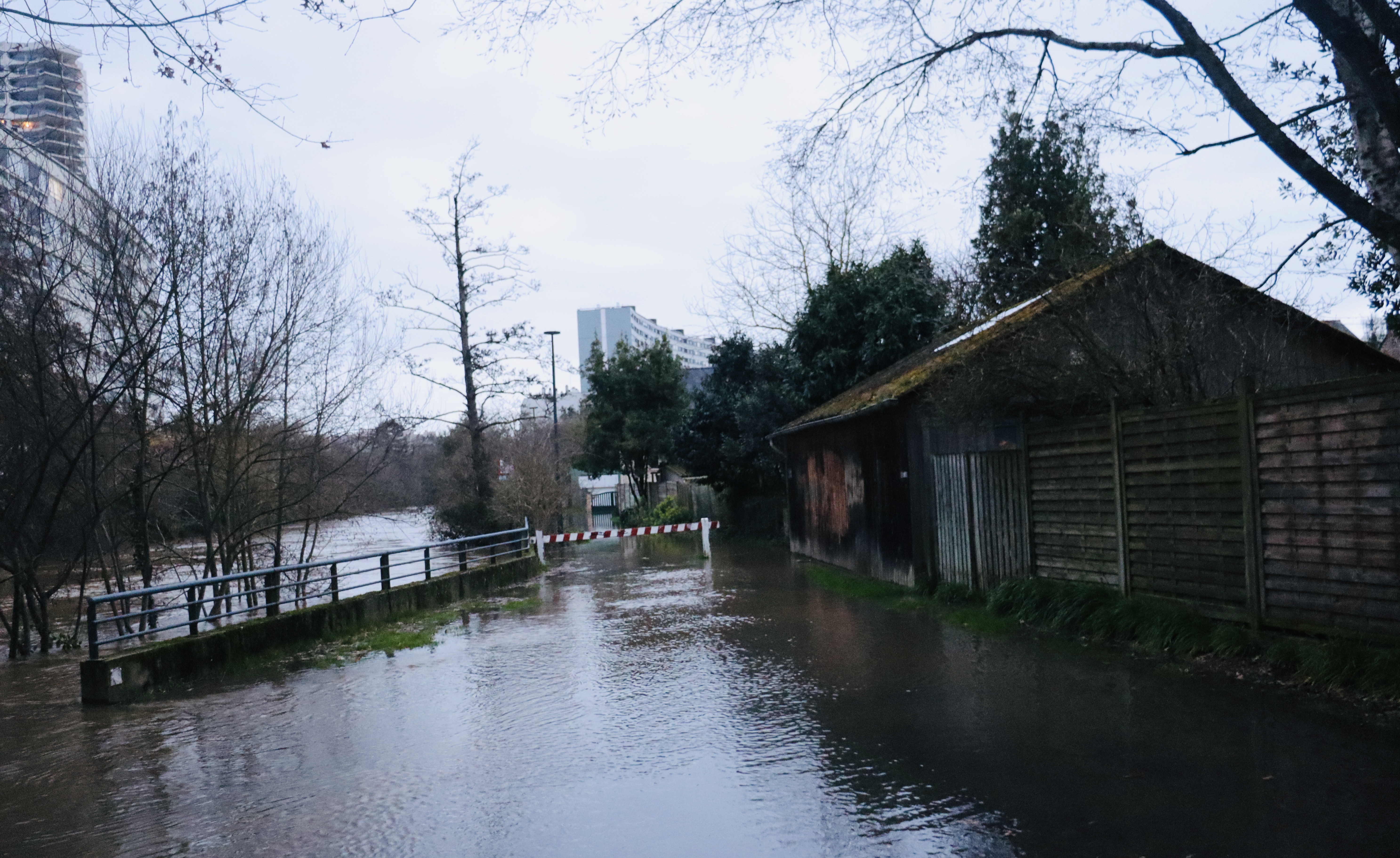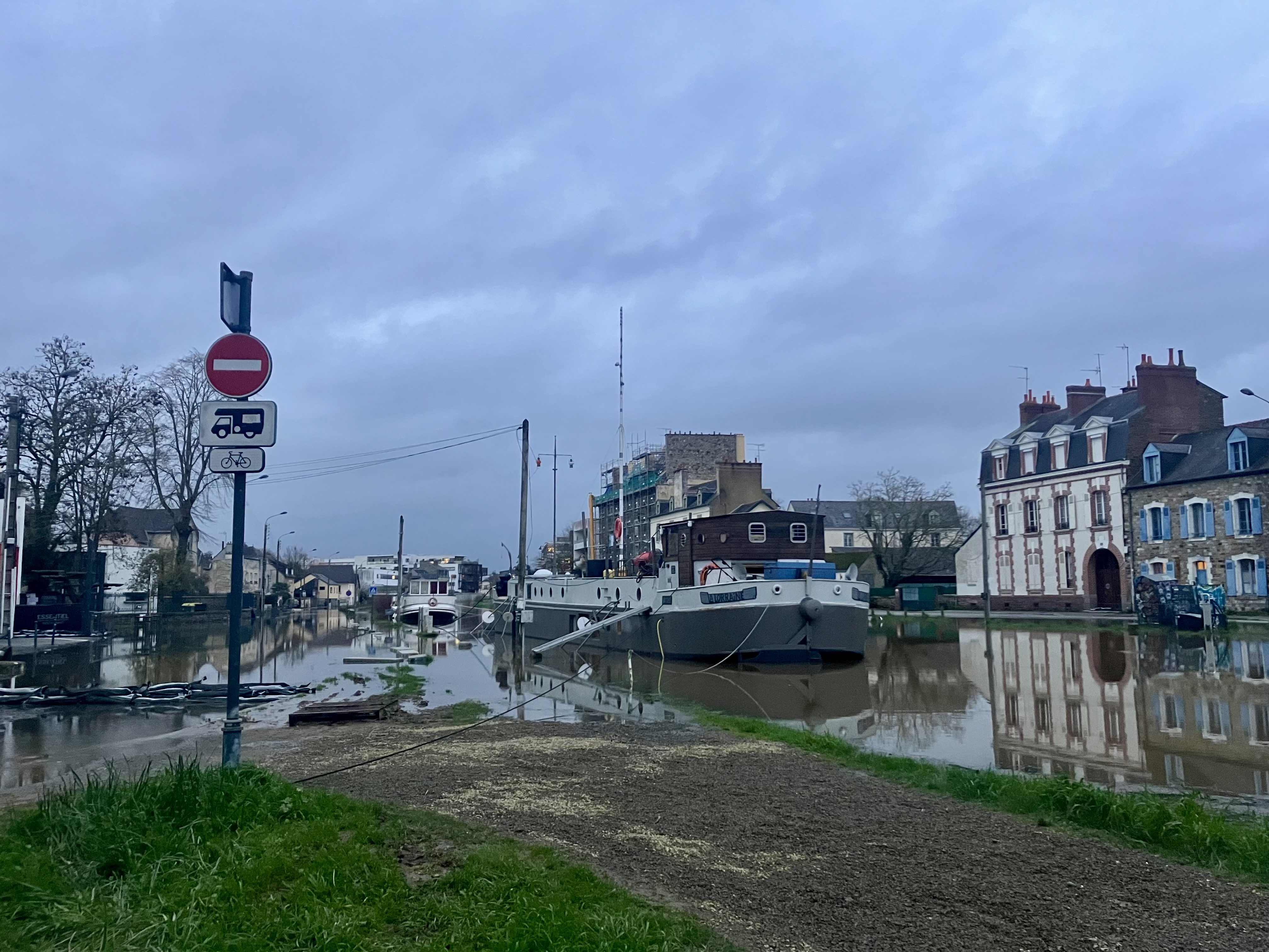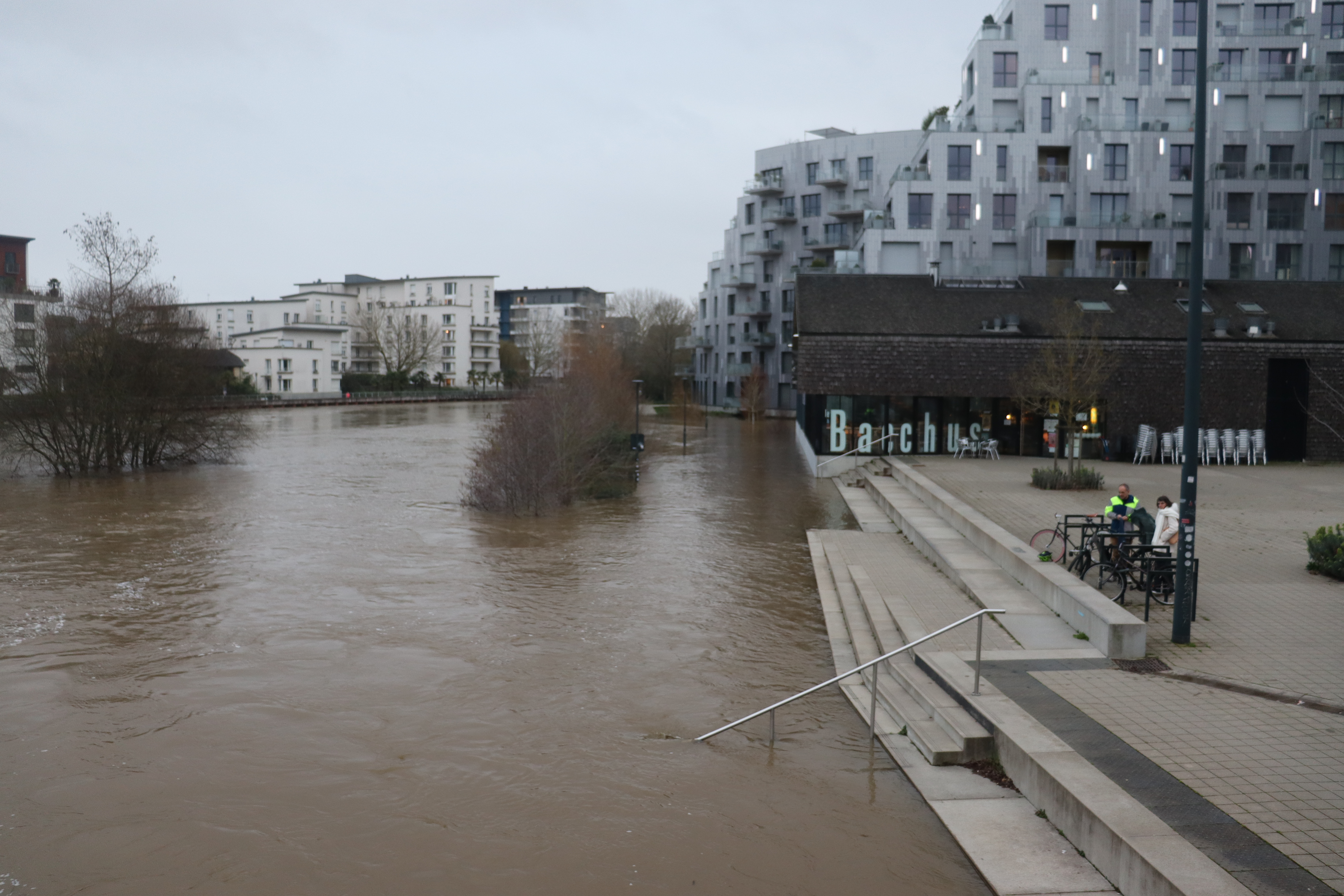 La nuit tombe, ce 19 février, sur les abords de la Vilaine. A hauteur du café-théâtre Bacchus, à deux pas du fleuve, pas de malplanches – ces lourdes plaques métalliques ou en bois, emboîtées les unes dans les autres, que l’on fixe devant portes et vitrines pour faire barrage à l’eau. Les pieds de l’établissement baignent tout simplement dans la rivière. Non loin, la passerelle de la Paillette est désormais interdite à la circulation piétonne. Sous elle, un bras du fleuve n’a plus rien d’un cours tranquille. Il se transforme presque en torrent.