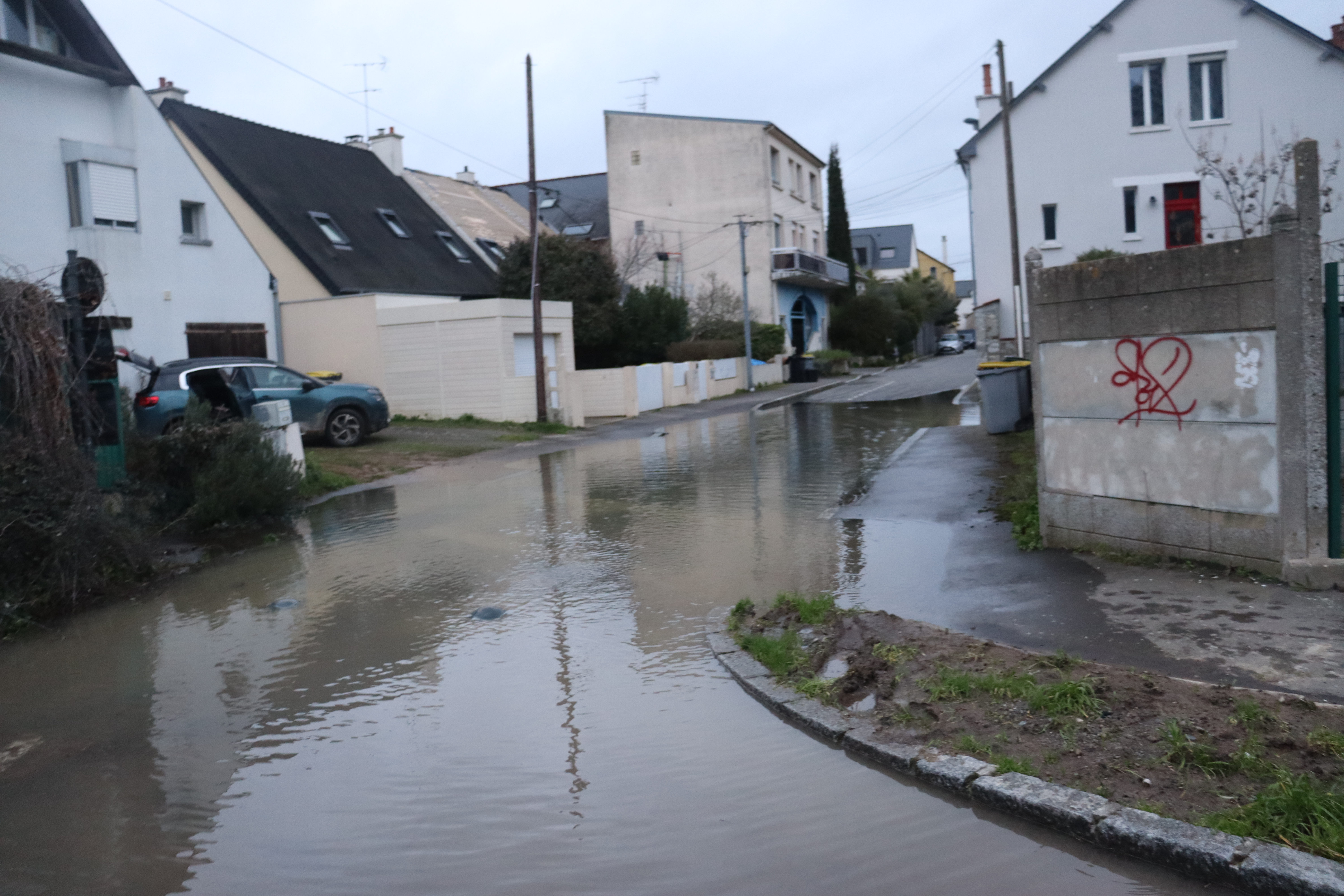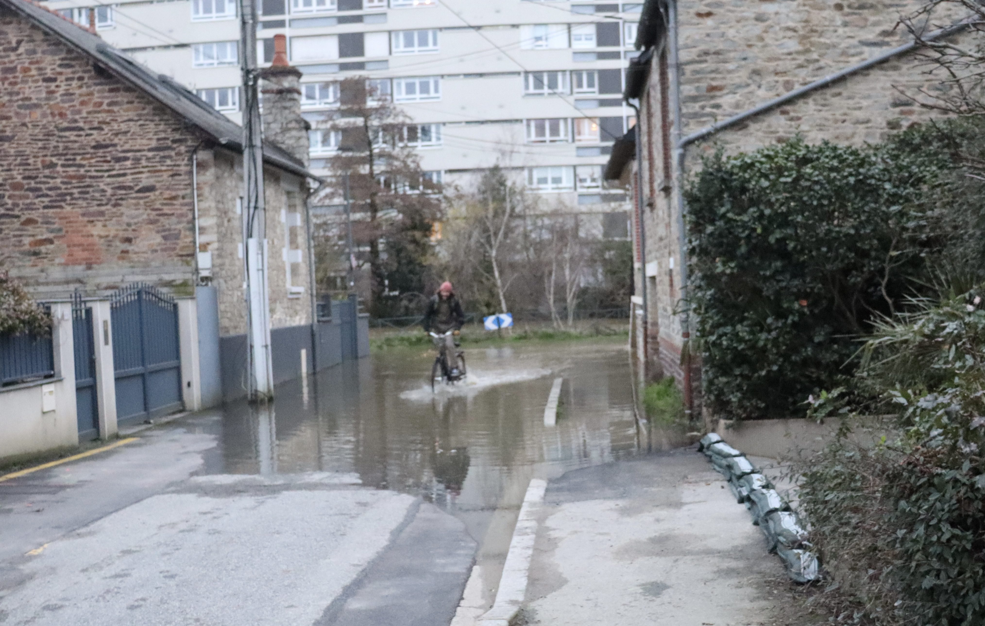 Plus en aval, dans la discrète rue de la Petite Touche, la chaussée est sous l’eau. Jean-François, habitant du quartier, pose des protections devant son garage. À ses côtés, Véronique observe la montée des eaux avec un mélange d’incrédulité et de tension. « Jusqu’à ce midi, j’étais plutôt optimiste. Je disais même aux amis : on va pomper comme les Shadoks l’ont fait à une époque. Sauf que là…je suis inquiète », lâche-t-elle. « L’année dernière, ce n’était pas monté aussi vite. Là, c’est monté très, très vite. »