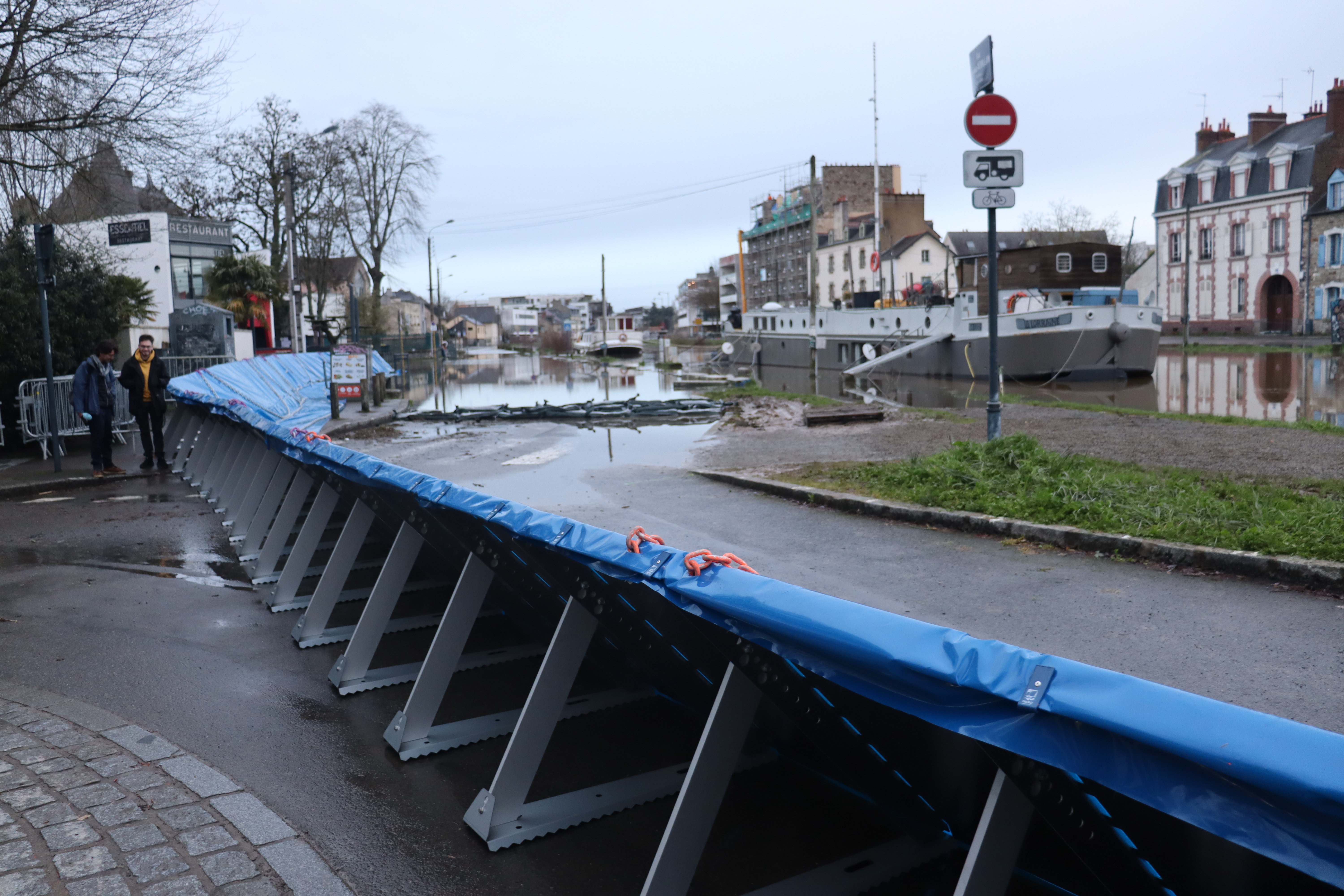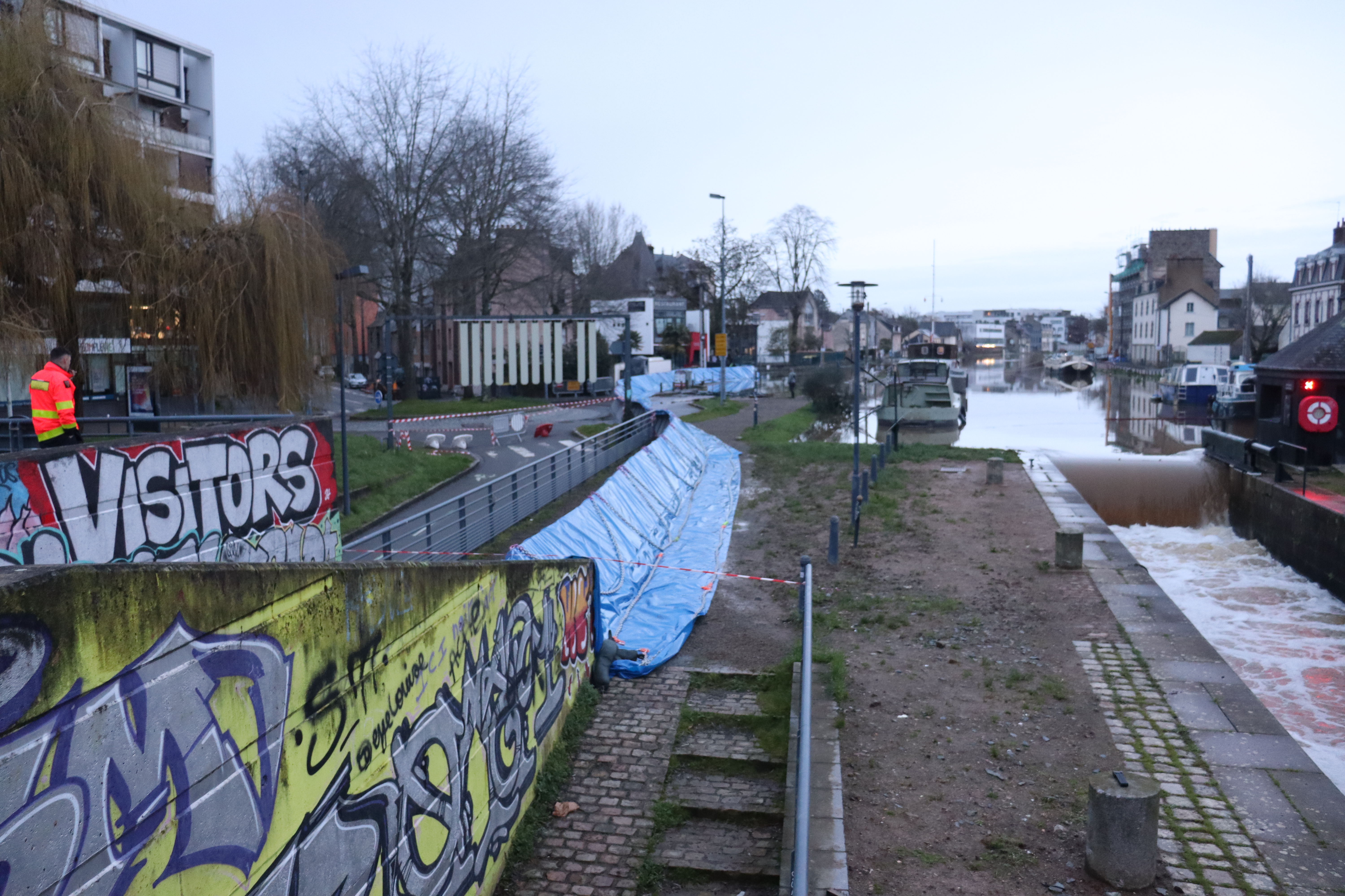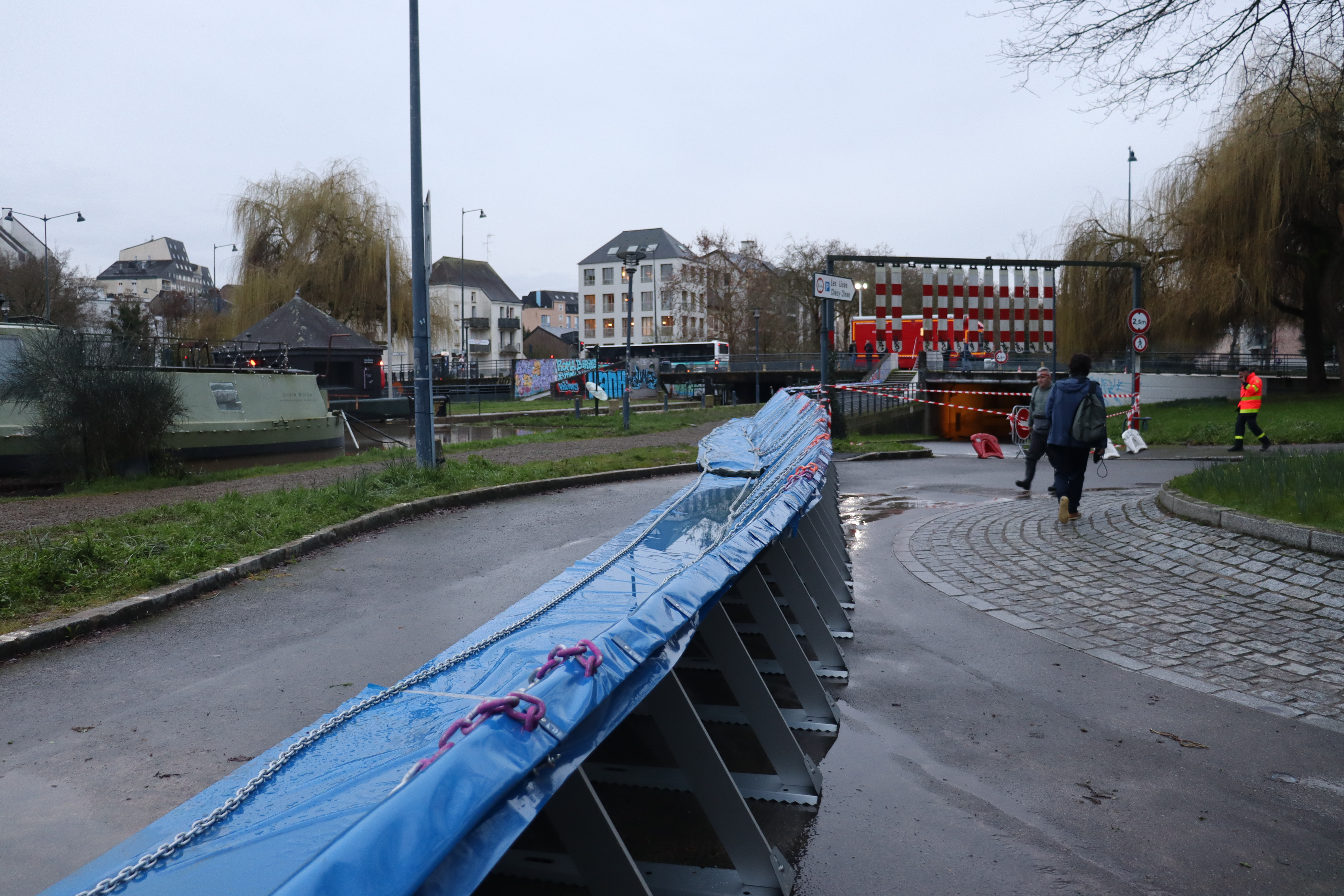 Ce vendredi 20 février, au petit matin, le long du canal Saint-Martin, à Rennes, à deux pas de la rue de Saint-Malo, les pompiers et la Sécurité civile veillent au grain. Dans la nuit, ils ont posé 105 mètres linéaires de barrage pour contenir la montée du canal. « Cet ouvrage est composé de jambes de force en aluminium, sur lesquelles est fixée une bâche maintenue par des poids et des chaînes lestées », explique le capitaine Romain Bertin-Butler, en charge du PC. « Il est conçu pour résister à la pression de l’eau et canaliser la crue. »