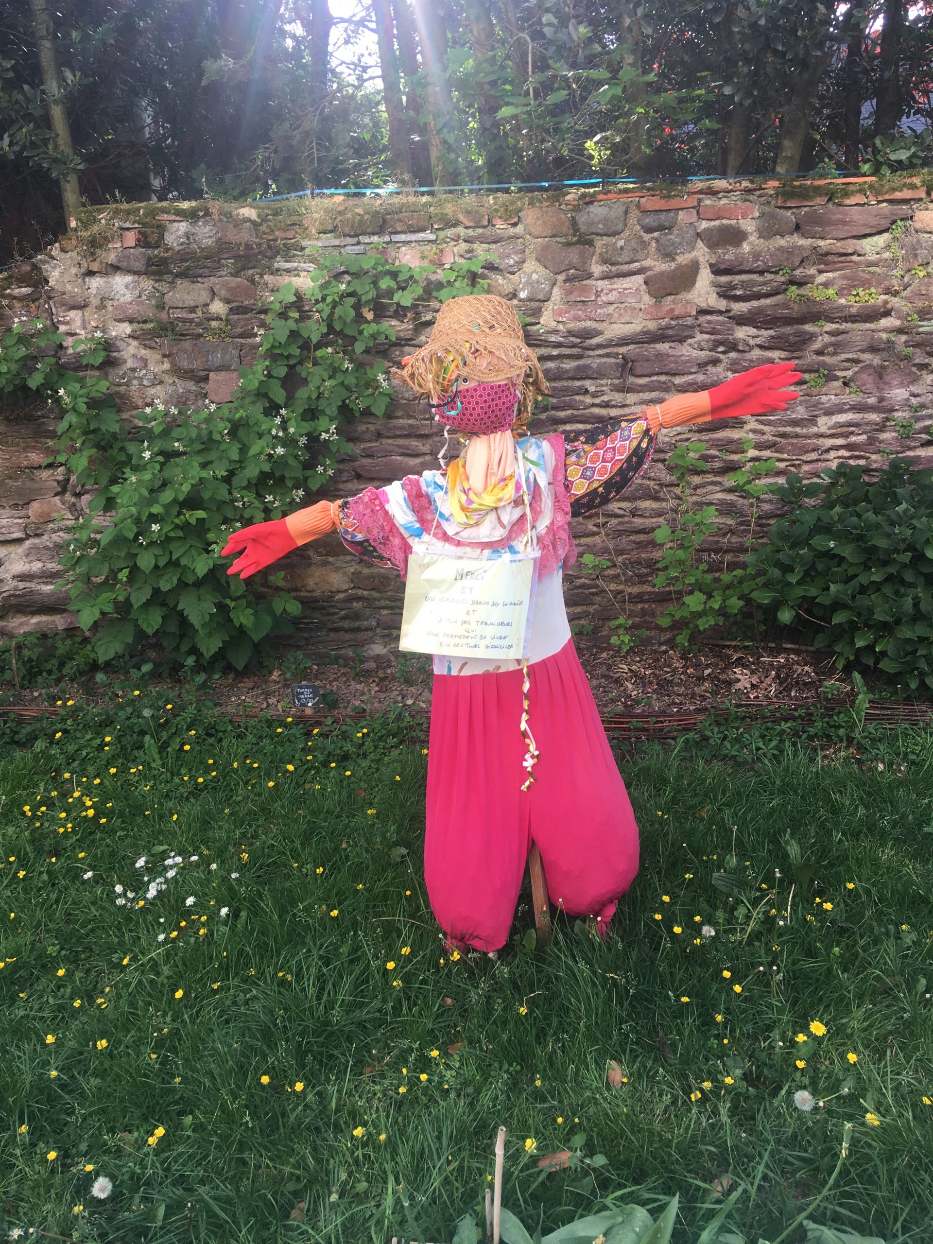 Caché derrière la cité Judiciaire et des immeubles d’Archipel Habitat, le jardin de Gergovie est tout minuscule et croquignolet à souhait. Devant son entrée, un épouvantail sort tout droit d’un film de Walt-Disney. Vêtu de rose et de blanc, le mannequin à l’allure baba possède quelques particularités et non des moindres. Outre son chapeau de paille du plus bel effet, il est tout simplement masqué et ganté pour effrayer les oiseaux picoreurs et, souhaitons-le, aujourd’hui ce terrible virus : le Covid-19. Posé là par les habitants des immeubles voisins et par les jardiniers de l’association Les trois Maisons, il porte aussi un message émouvant autour de son cou. « Bravo aux soignants et aux travailleurs qui permettent de vivre en ces jours difficiles », est-il écrit sur une petite pancarte. Espérons que cet épouvantail n’agitera pas de vaines terreurs au coronavirus…