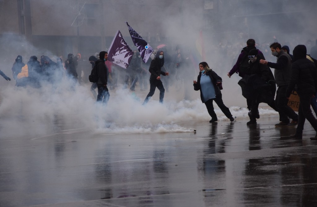 Durant deux heures, ce fut le jeu du chat et de la souris ! Le canon à eau faisait régulièrement reculer les plus récalcitrants, qui, derrière plusieurs banderoles et cachés sous des parapluies, revenaient à la charge et jetaient des projectiles contre les gendarmes. Parfois, des bombes lacrymogènes étaient lancées pour disperser la foule sous les yeux des passants interloqués, comme venus au spectacle.