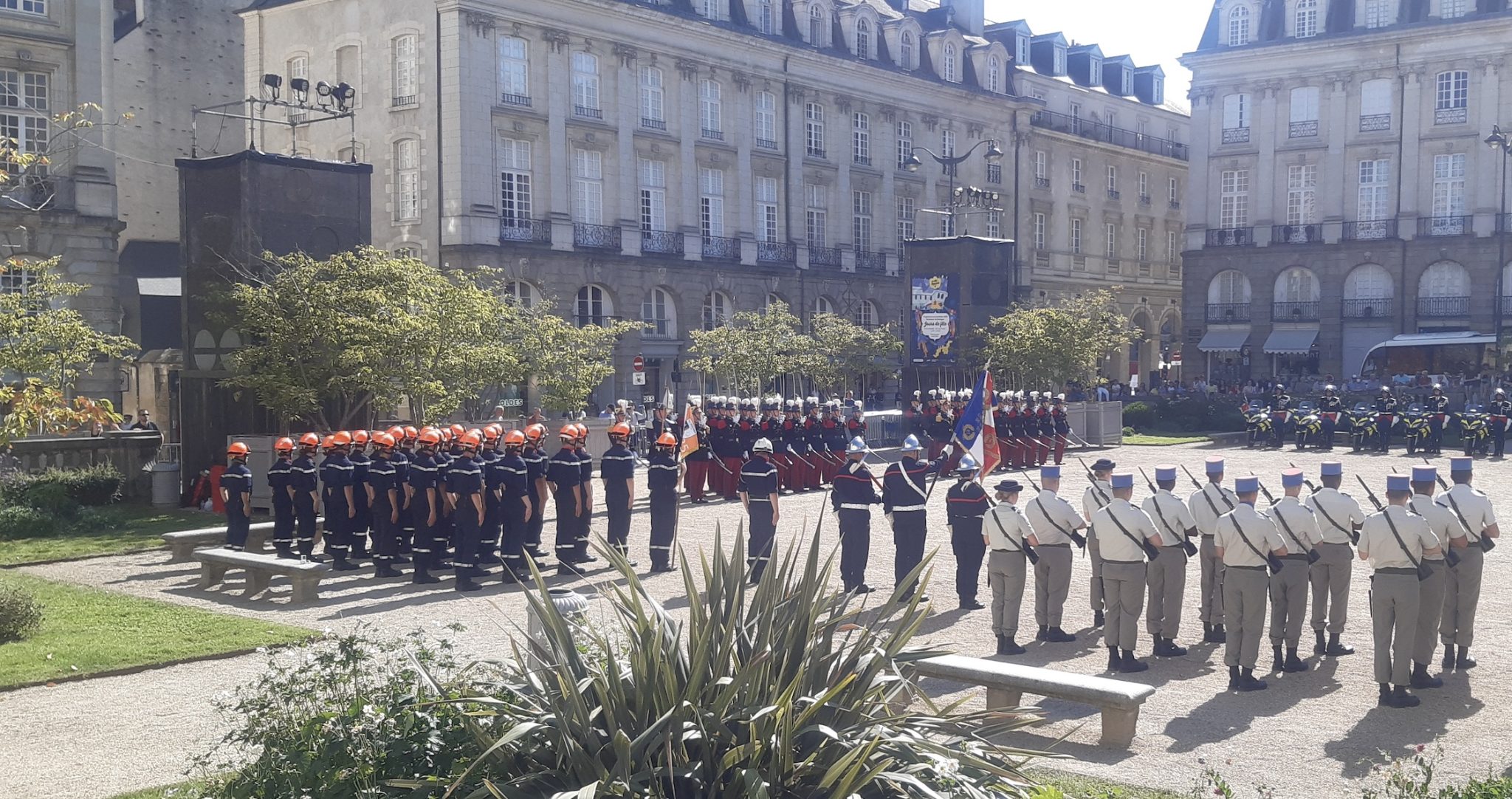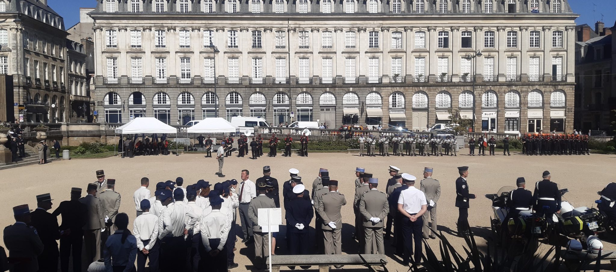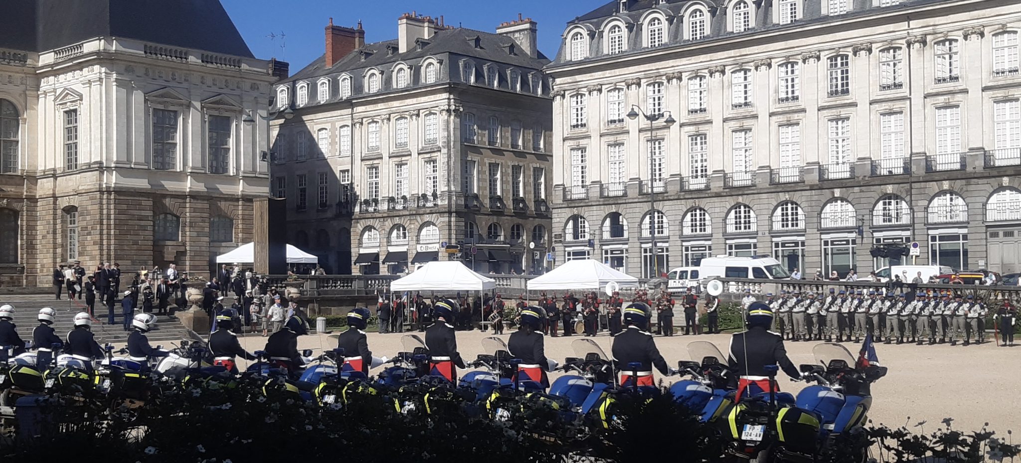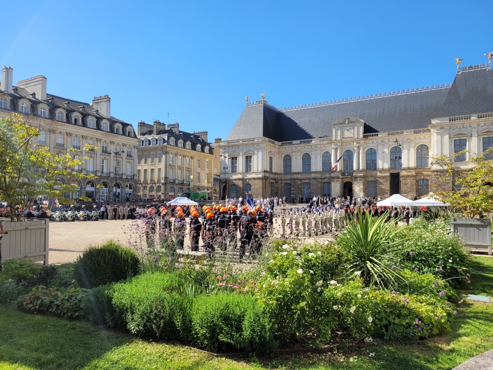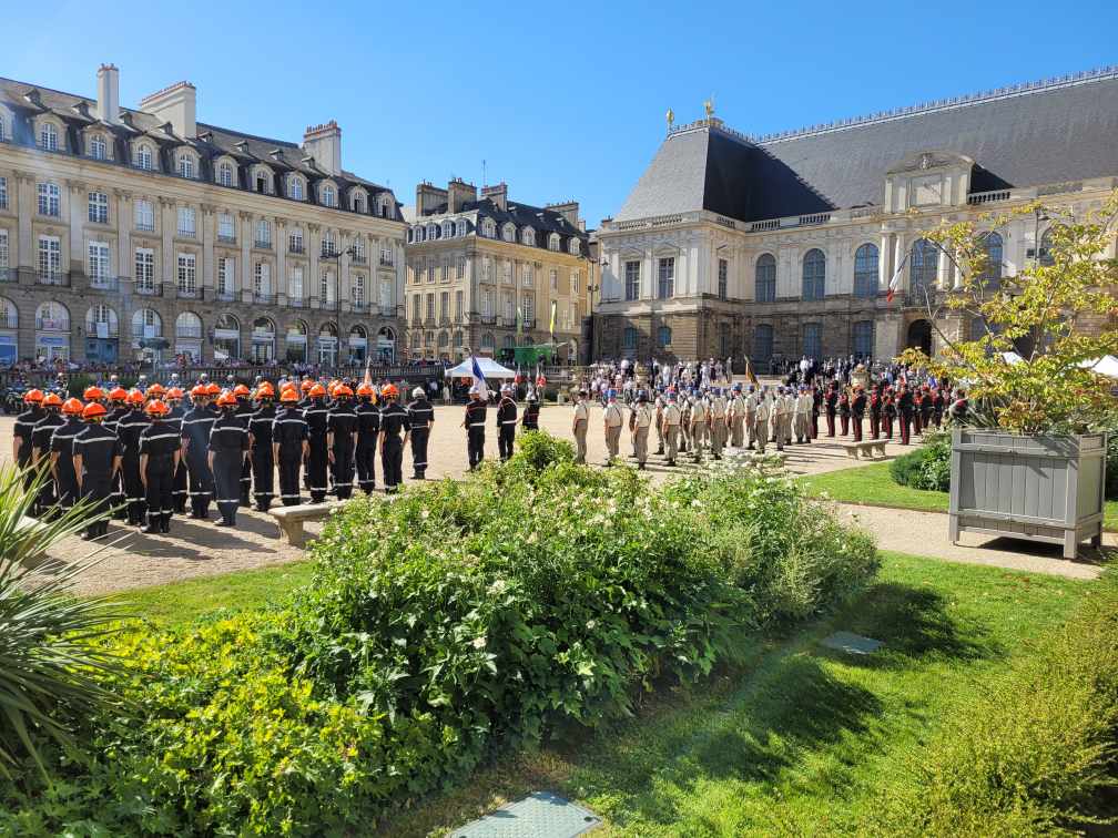 En ce mercredi 13 juillet 2022, place du Parlement, c’était grand soleil et température élevée. Mais pas de quoi entamer le moral des troupes ! Pour la cérémonie du 14 juillet (avancée d’une journée dans la capitale bretonne), il y avait du beau monde à suer à grosses gouttes dans des uniformes heureusement estivales. On comptait des personnalités civiles et militaires, dont le préfet Emmanuel Berthier et l’adjoint du maire, Marc Hervé remplaçant au pied levé Nathalie Appéré (pour cause Covid). Au milieu de la place, les motards de la police, les élèves officiers de Saint-Cyr et le 2e Régiment du matériel de Bruz ont été salués par de nombreux badauds (trouvant refuge à l’ombre) pour leur impassibilité sous le cagnard. Absents, la 4e batterie du 11e Régiment d’artillerie de marine de Saint-Aubin du Cormier et les jeunes de la préparation militaire marine participeront au défilé du 14 juillet sur les Champs-Élysées. Crédit photos : Dragan Brkic et Marine C.