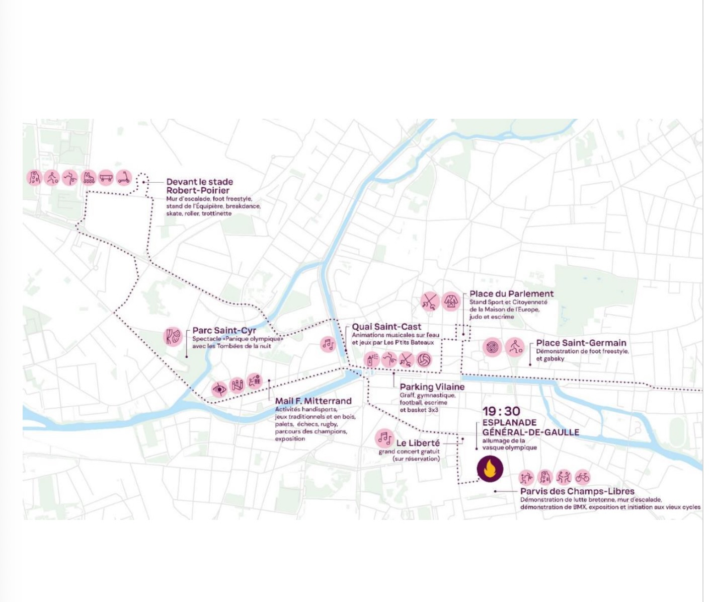 Des animations gratuites tout au long du parcours seront proposées de 14 h à 18 h. Une trentaine d’associations sportives et culturelles sont mobilisées sur les 8 sites d’animation : Plages de Baud (baptême de kayak, kinball et guinguette) ; place Saint-Germain (démonstration de foot freestyle et gabaky) ; place du Parlement (stand sport et citoyenneté de la Maison de l’Europe, escrime et judo) ; Parking Vilaine (graff, gymnastique, football, basket 3×3) ; quai Saint-Cast (animation musicale sur l’eau et sur les péniches par les P’tits bateaux) ; Parc Saint-Cyr (un spectacle chorégraphique XXL reliant les Jeux olympiques de Paris, la danse contemporaine et la pratique amateur, avec les Tombées de la nuit) ; devant le stade Robert-Poirier (mur d’escalade, foot freestyle, stand de l’Équipière, breakdance, skate, roller, trottinette) ; Mail François-Mitterrand (basket senior/santé, parcours des champions, volley handisport et parcours handicap visuel, échecs, jeux en bois, palets bretons et jeux traditionnels des pays du monde, animation de rugby, exposition tout le long du mail et tout l’été « Histoire, Sport & Citoyenneté) ; parvis des Champs-Libres (lutte bretonne, mur d’escalade, break, démonstration Bmx, exposition et initiation vieux cycles) ; Au Liberté (grand concert gratuit sur réservation).