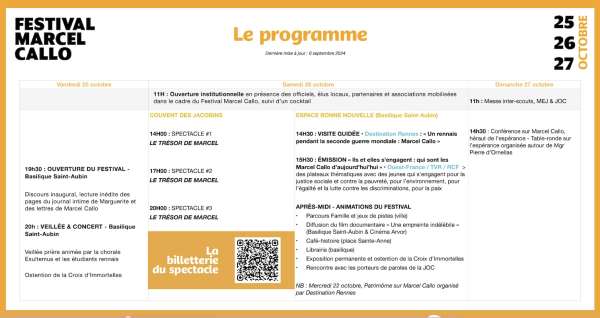 En parallèle du spectacle, d’autres événements rythmeront les trois jours du festival : visites guidées de l’exposition sur Marcel Callo, projections du documentaire Une vie en mission, et une marche de l’espérance. Une émission spéciale, réalisée par Ouest-France, mettra également en lumière des jeunes engagés dans des causes sociales. Avec ce festival, le diocèse de Rennes tient à rappeler le message de son bienheureux particulièrement pertinent dans le contexte actuel de crises politiques. « Qu’il soit spirituel ou laïc, il résonne profondément auprès de la jeunesses en quête de sens aujourd’hui », ajoute Mgr Pierre d’Ornellas.
