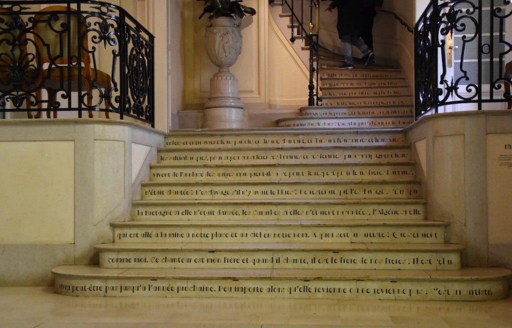 A défaut d’être invités dans le bureau de madame la maire…les Rennais peuvent découvrir sur les marches des escaliers un poème d’un des plus grands poètes bretons : Yvon Le Men. En grimpant lentement l’escalier, ils pourront apprécier les rimes, les mots et l’écriture. En prenant le temps, ils pourront l’apprendre par coeur et retenir pourquoi pas cette petite phrase : « ce chanteur est mon frère et quand il chante, il est le frère de nos frères ».
