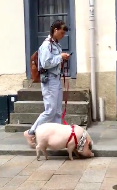 Ce vendredi, une jeune femme s’est promenée tranquillement avec son cochon en laisse dans les rues de Rennes. Prénommé Gustave (selon quelques témoins), l’animal avec un bandana et sa maîtresse ont été filmés à plusieurs reprises par des passants. Leurs vidéos ont fait le buzz sur les réseaux sociaux et suscité pas mal de commentaires. Espérons que la bête ne finisse pas en chair à pâté dès ce soir pour approvisionner les stands des galettes-saucisses des Lices. Il y a un an, un homme avait provoqué un vif émoi sur la toile en visitant Rennes avec son poney !